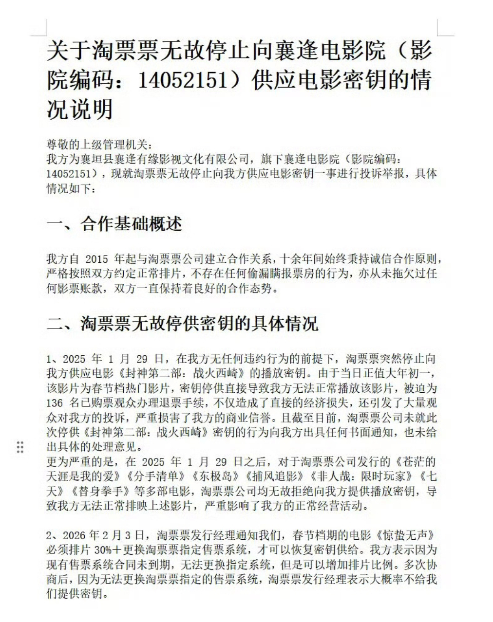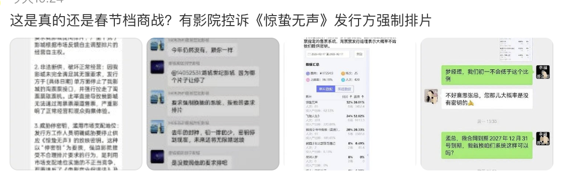 疑似有电影院经理控诉《惊蛰无声》发行方淘票票强制要求排片30+%,必须切换售票系统才给秘钥,该事件还涉及《东极岛》《捕风逐影》等其他电影。