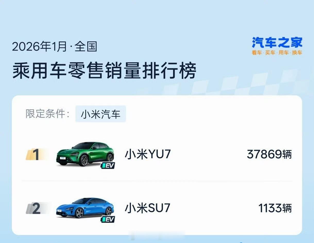 小米汽车1月销量:(图1、图2SU7(老款停产):1133台YU7 :37869台,1月新能源车销冠