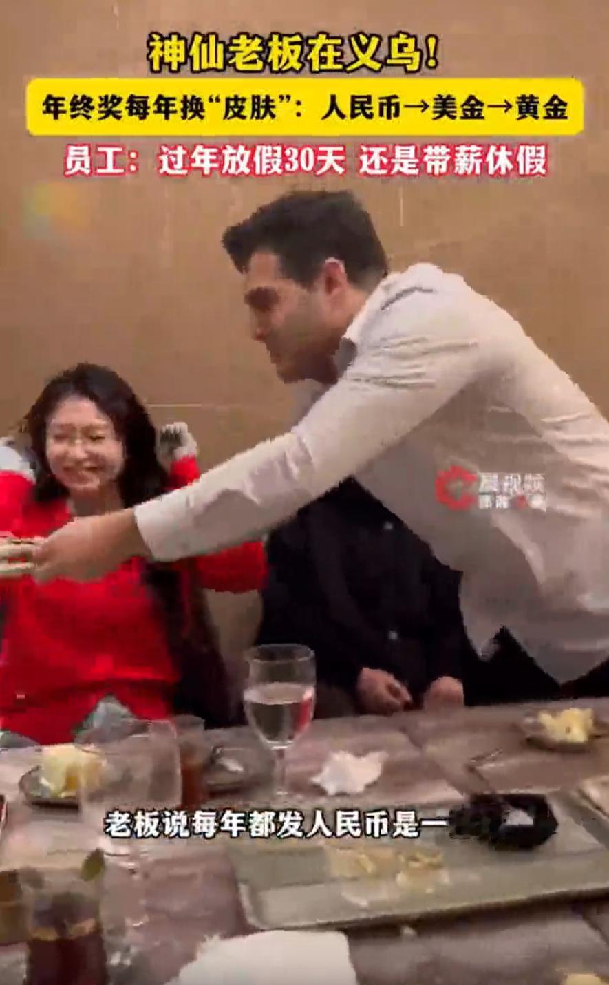 这是什么神仙老板!浙江义乌,一女子公司老板是一名外国人,老板不仅每年都会给员工发上万的年终奖,而且还很有新意的换成不同币种和形式,今年发美元,明年就发黄金,就连带薪假期都有30天。网友:这样的老板绝对没人背后蛐蛐 女子介绍,自己在这家公司已经有12年的时间,从自己来的那天起,每年都会收到红包,而且外国老板会根据大家的习俗,认为金额里面有个“8”会比较吉利,自己最早时能拿2000多块钱,今年已经10000多了 有意思的是,老板觉得如果每年都发人民币没什么新鲜感,于是改变了一下形式,人民币、美金、黄金,轮番发放,这让员工们也很有新鲜感 不止是员工,就连房东、保洁阿姨也会收到礼品,就连公司的员工都认为遇到了神仙老板 很多人以为神仙老板是有钱。但有钱的人很多,愿意年年发、年年涨、还变着花样发的人,不多。更多的人以为神仙老板是脾气好、不管事。但真正让员工踏实干十年的,恰恰是那些看见你、记得你、心里有你的人 年终奖的厚度,决定员工过什么年。老板的用心,决定员工跟不跟你 义乌这个老板给房东、保洁也送礼,看似多余,其实是一笔极划算的账。员工看见老板怎么对别人,就知道老板将来会怎么对自己 能在一家公司干12年,不是靠什么企业文化标语,是靠每年年底那一下,老板把钱塞进你手里,眼睛看着你,说这一年辛苦了