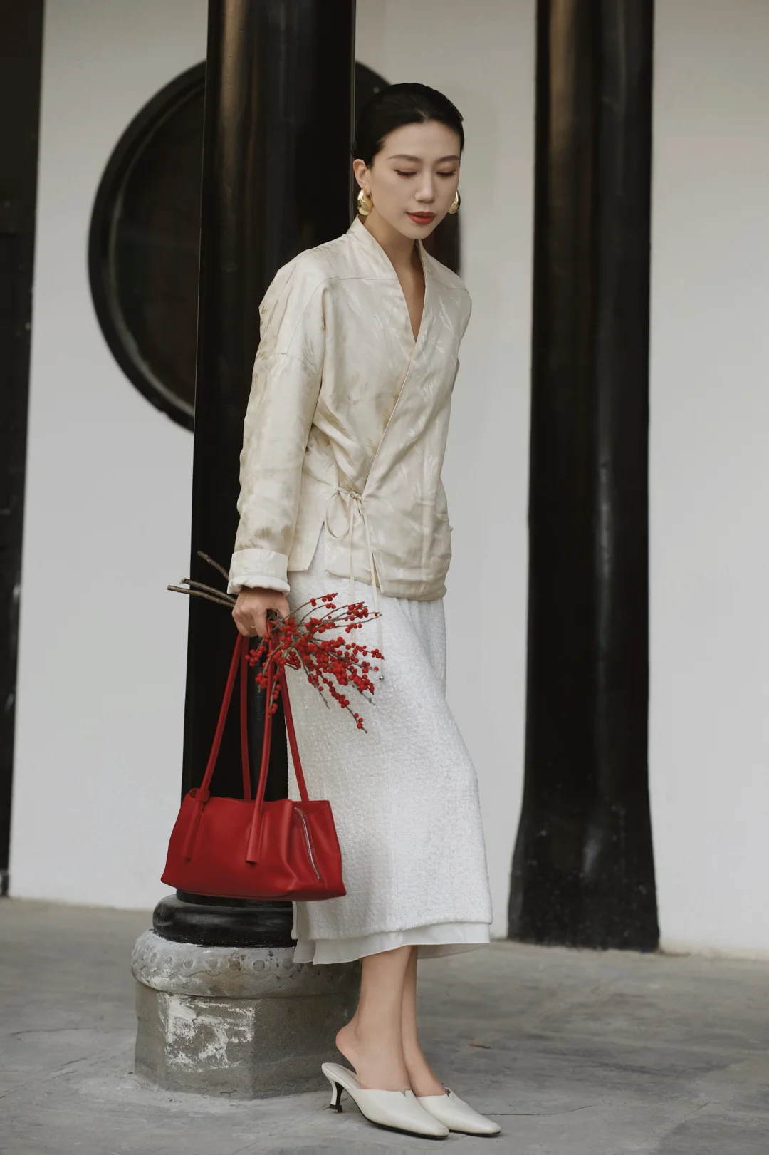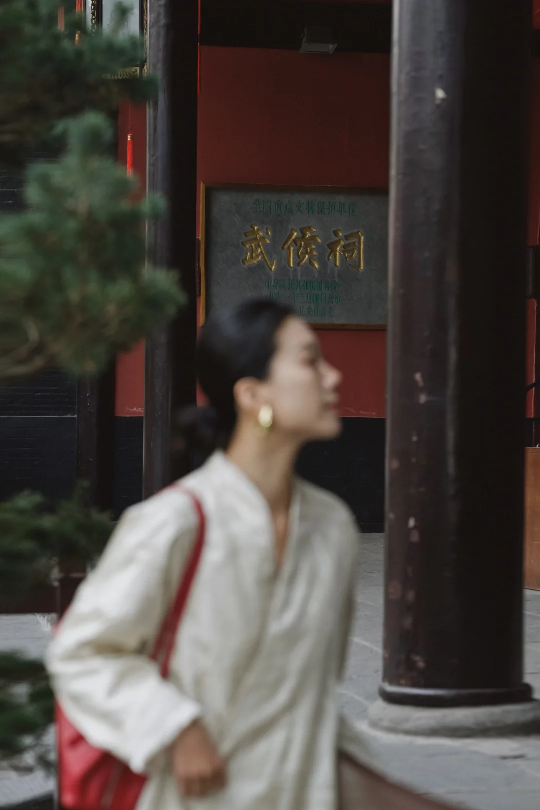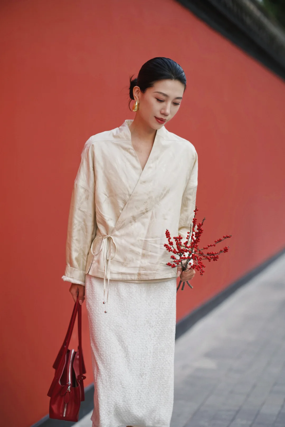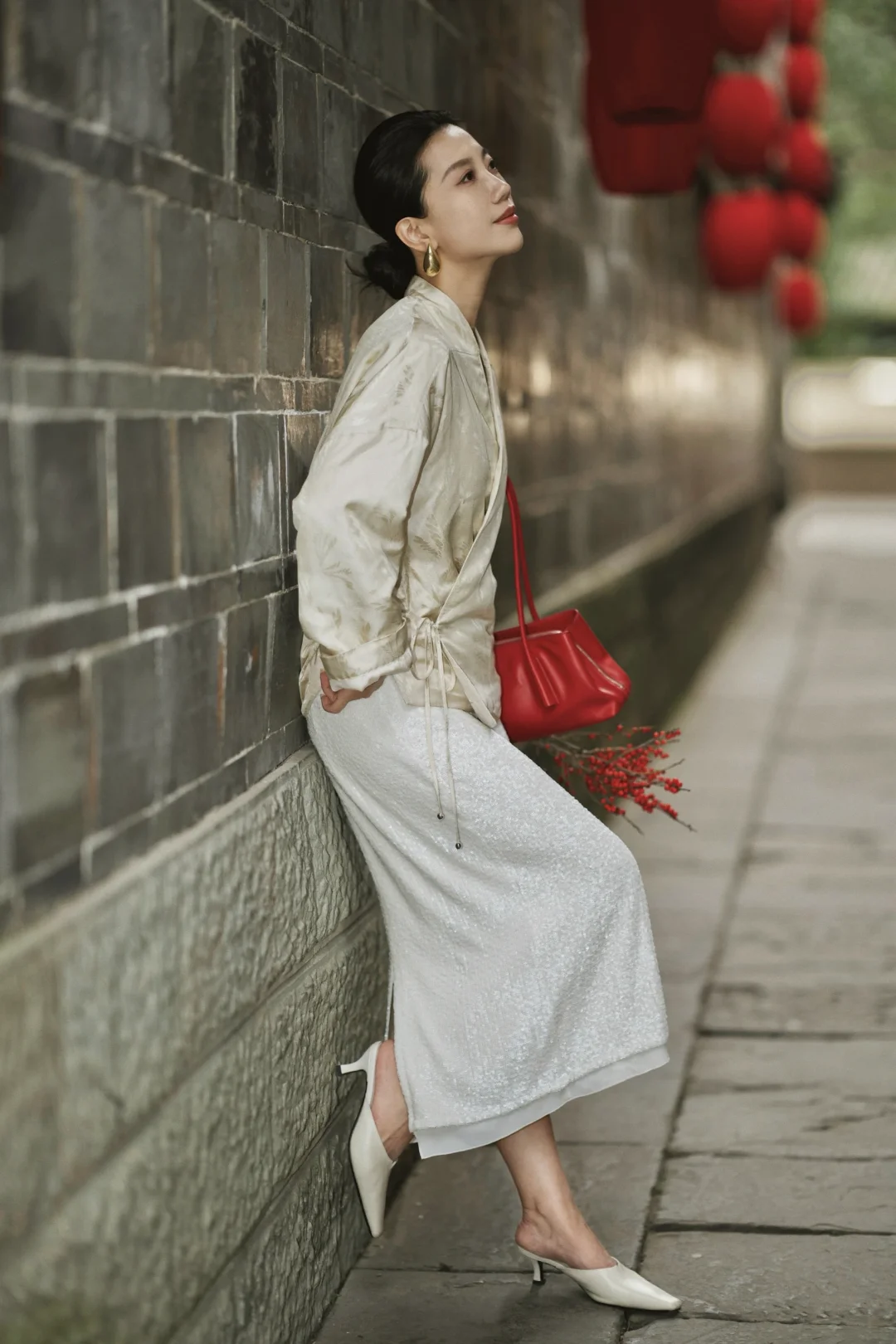岁末的成都,终于从繁忙的缝隙里,漏出一段属于我的慢时光。趁年前的闲日,再去武侯祠与锦里走走。 武侯祠的红墙竹影,静默如史。绿意沿壁蔓生,阳光筛下,恍惚与千年智慧低语。一墙之隔的锦里则溢满人间烟火,漫步其中,街巷被暖融融的熊猫灯笼点亮,与满街的红灯笼交织,为冬夜添上可爱的暖意。 沿街的铺子里,手艺人正凝神运笔,现场为客人书写书画,或巧手制作糖画、剪纸。暖融融的热闹直抵人心——原来这座城市的气韵,既是肃穆的传承,亦是活泼的当下。 特意穿了新中式穿搭,LESS提花真丝上衣泛着温润光泽,与古建纹理悄然呼应;珠片半身裙随步轻摆,似为古朴街景添上一抹流动的星光。典雅设计不争不抢,却恰好融进这幅底蕴深厚的画卷里,让身与心,都归属此刻的宁静与温度。