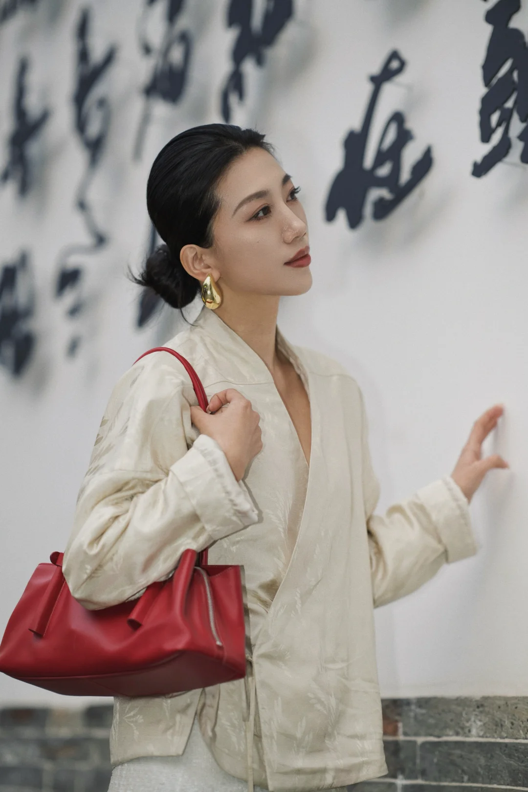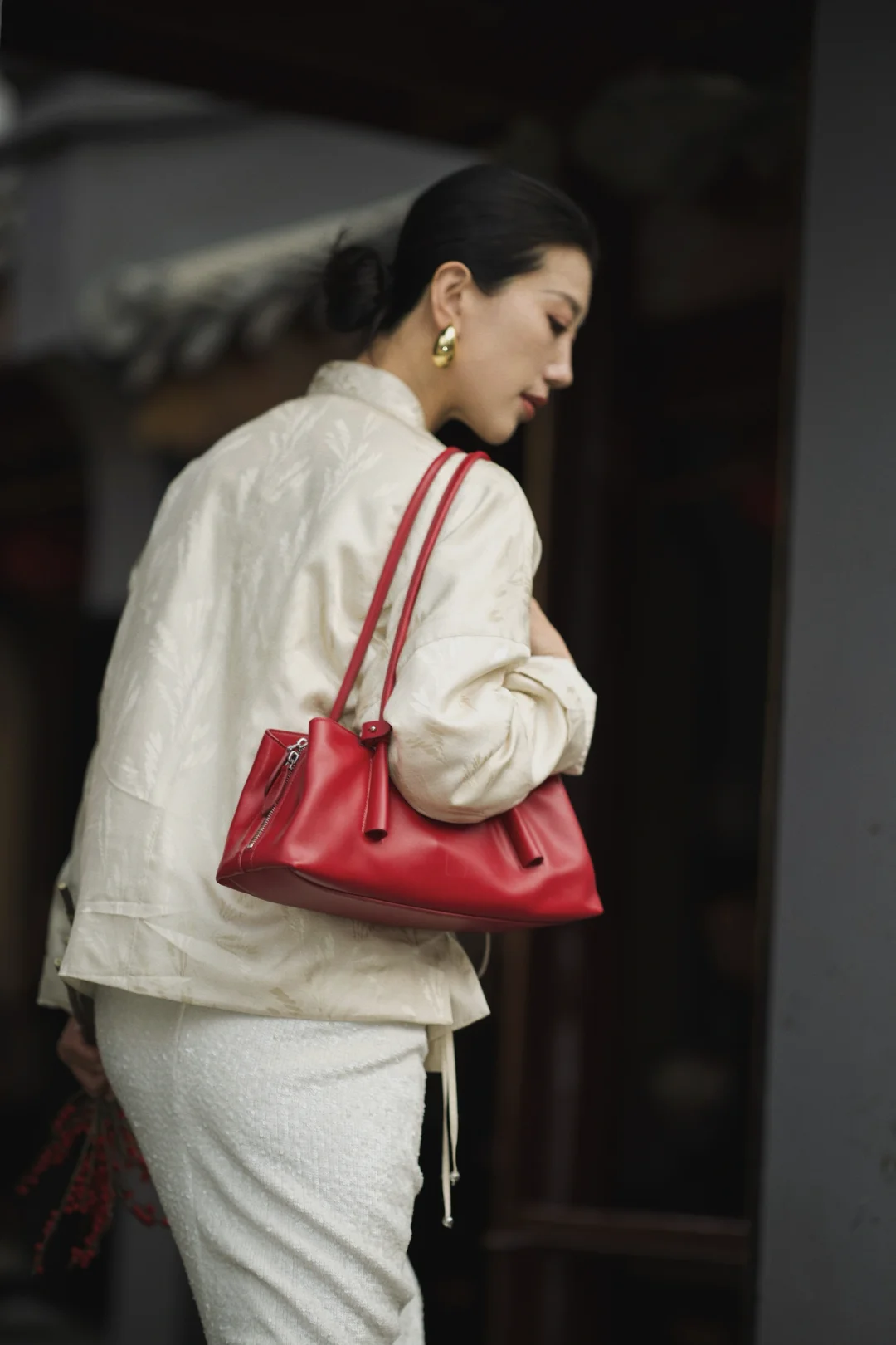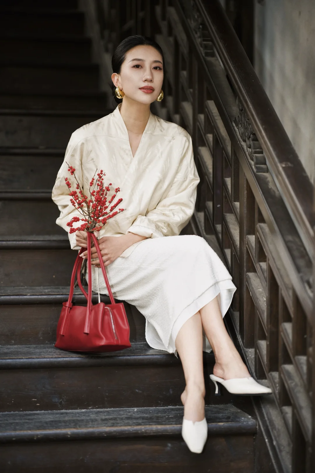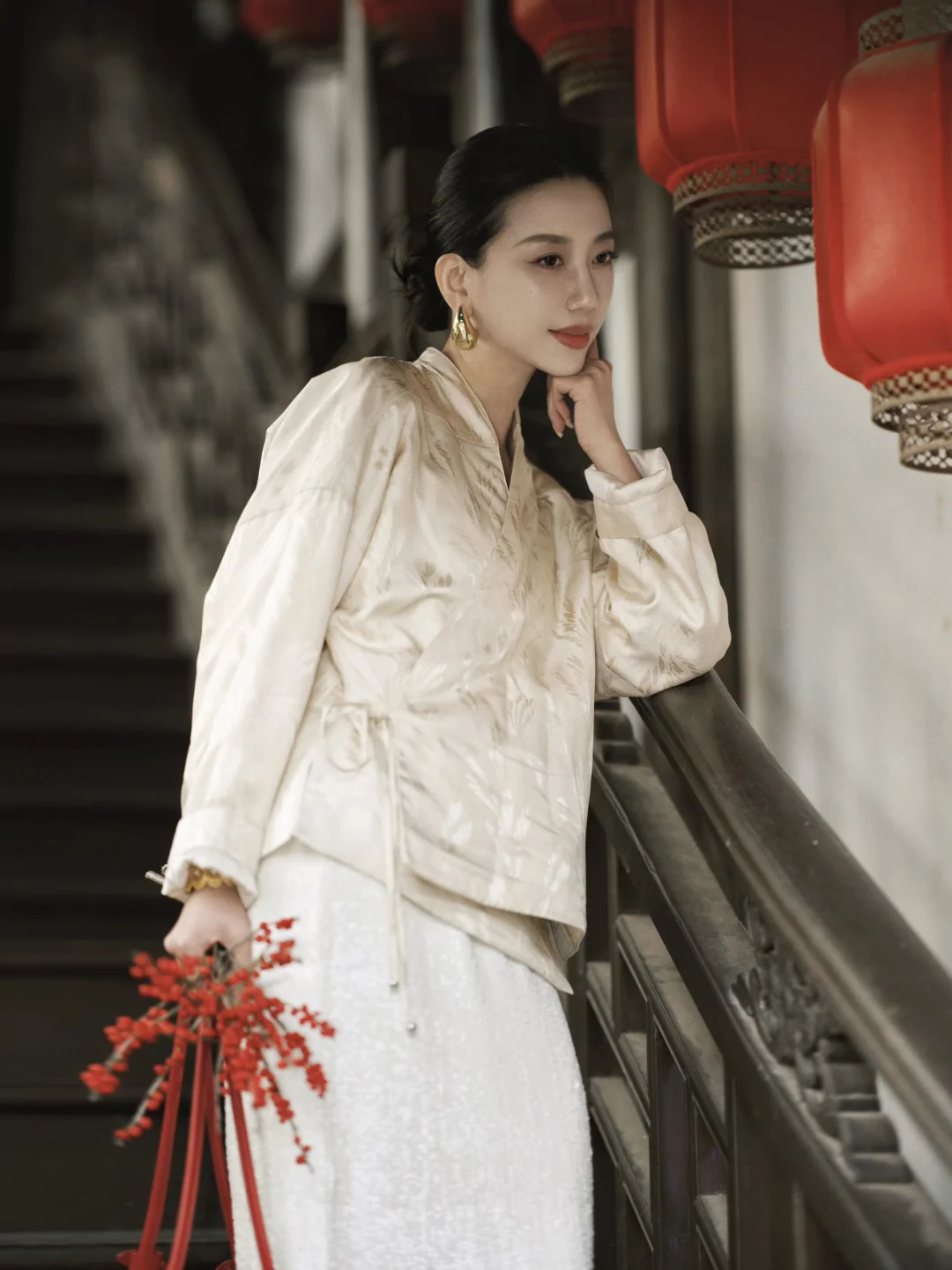 岁末的成都,终于从繁忙的缝隙里,漏出一段属于我的慢时光。趁年前的闲日,再去武侯祠与锦里走走。 武侯祠的红墙竹影,静默如史。绿意沿壁蔓生,阳光筛下,恍惚与千年智慧低语。一墙之隔的锦里则溢满人间烟火,漫步其中,街巷被暖融融的熊猫灯笼点亮,与满街的红灯笼交织,为冬夜添上可爱的暖意。 沿街的铺子里,手艺人正凝神运笔,现场为客人书写书画,或巧手制作糖画、剪纸。暖融融的热闹直抵人心——原来这座城市的气韵,既是肃穆的传承,亦是活泼的当下。 特意穿了新中式穿搭,LESS提花真丝上衣泛着温润光泽,与古建纹理悄然呼应;珠片半身裙随步轻摆,似为古朴街景添上一抹流动的星光。典雅设计不争不抢,却恰好融进这幅底蕴深厚的画卷里,让身与心,都归属此刻的宁静与温度。