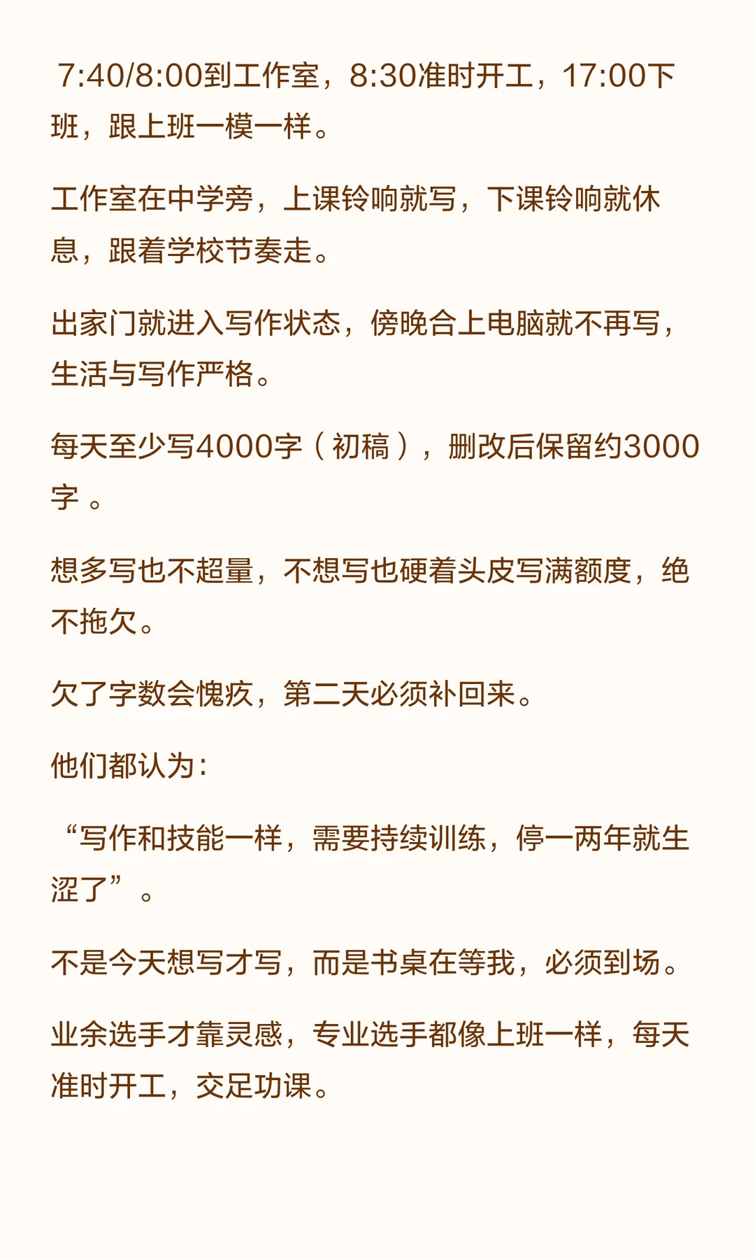 斯蒂芬·金、村上春树和马伯庸等作家通过每日固定时间、自律写作,积累了大量作品。 他们强调写作是日常训练,需要持续专注与坚持,才能保持创作力与质量。 业余写手才靠灵感,专业选手都是每天准时出摊儿,跟上班一样自律。