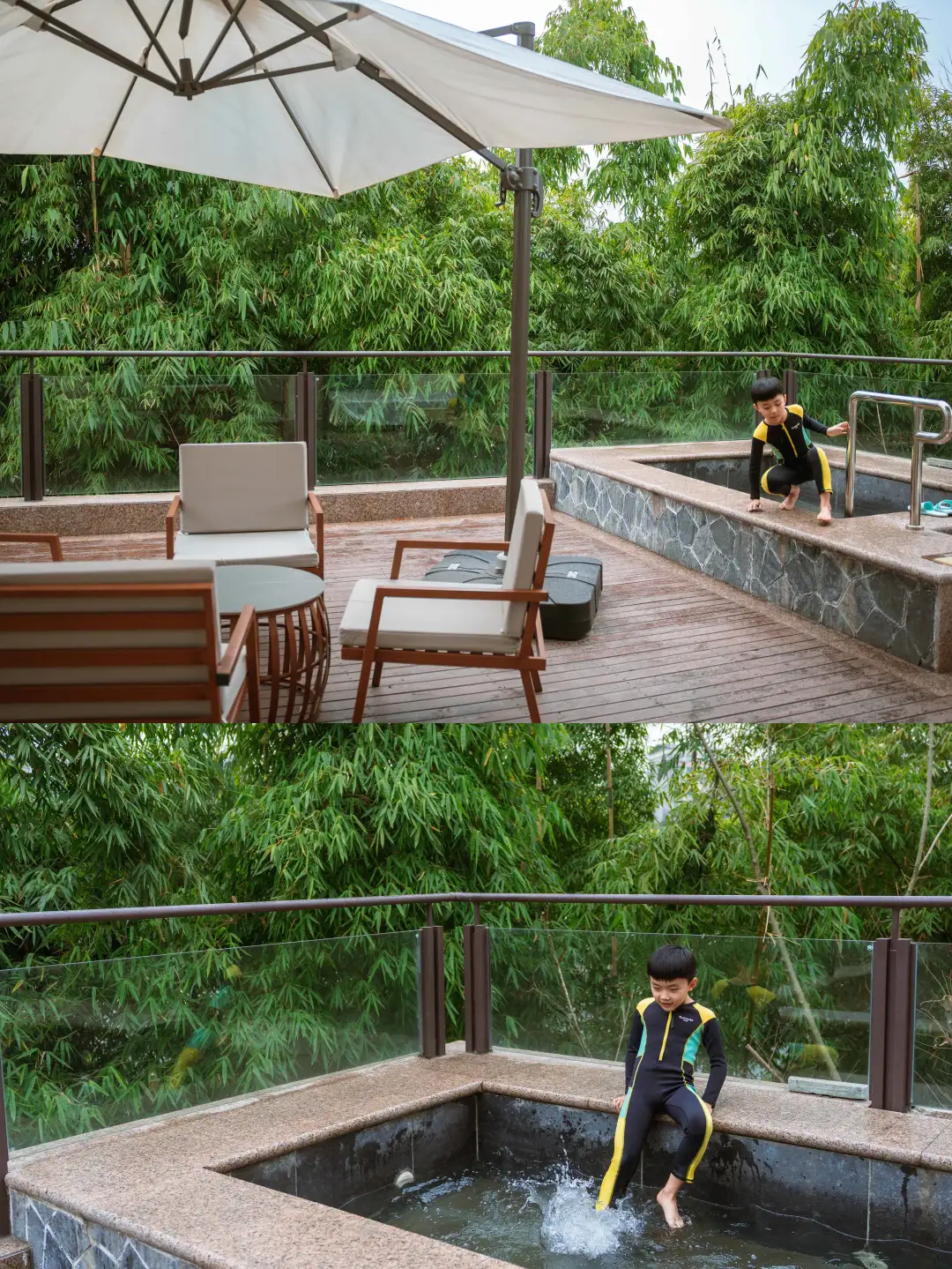 我们订的家庭套房,两个独立房间+客厅+小院子+露台私汤!爸妈住一间,我和孩子住一间,白天在院子里喝茶聊天,孩子在露台玩水撒欢,泡个私汤解解乏,舒服到不想走;