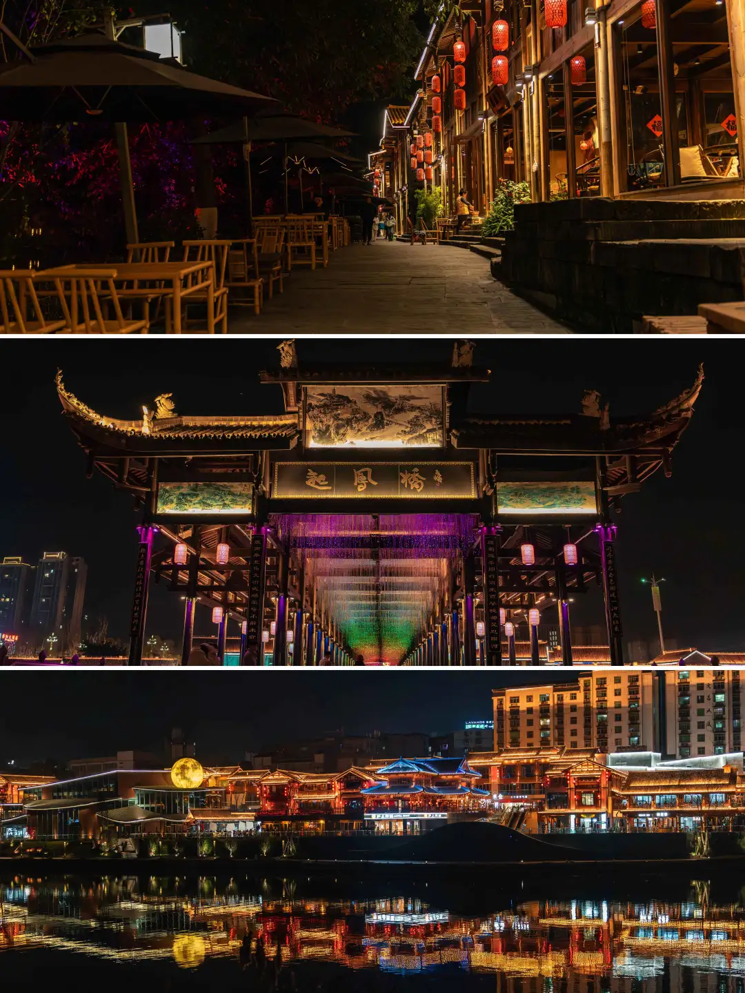 从古镇逛完,过一座小桥就到梦华录街区啦~ 夜晚沿街的红灯笼、氛围感十足的鱼灯全亮起来,暖黄色的灯光倒映在恩阳河上,波光粼粼的,随手一拍都是大片。