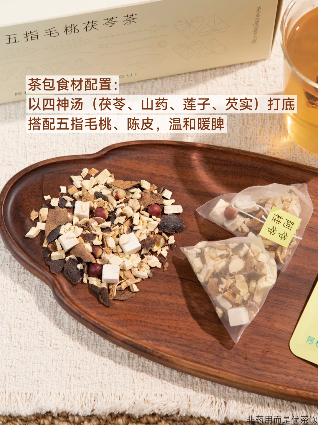 茶方以四神汤(茯苓、山药、莲子、芡实)打底, 搭配五指毛桃、陈皮,温和暖脾