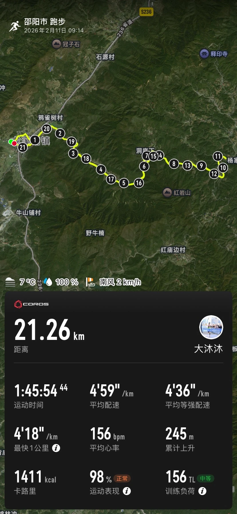 回村第一天,解锁盘山公路21.26km✅ 累计爬升245,从四中一路干到龙口七 穿过了两个村,被大黄狗目送半里地🐕 说好的回村养生跑呢? 一个大长坡直接给我整明白了 腿在骂人,眼睛在说谢谢👀 坡顶一回头——整片山野都是我的 你回村跑步了吗?