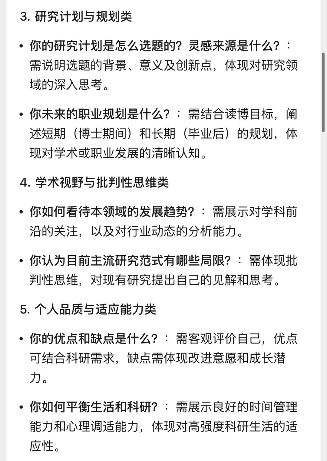 · 你为什么想读博?:需体现对学术研究的热爱、对特定领域的执着追求,以及读博对个人发展的意义。