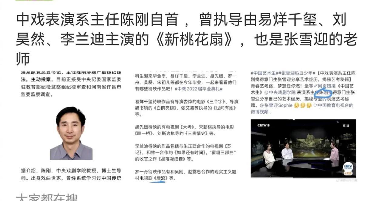 中戏表演系主任陈刚自首了,曾经执导过易烊千玺、刘昊然、李兰迪等主演的《新桃花扇》,张雪迎还是他的得意门生。