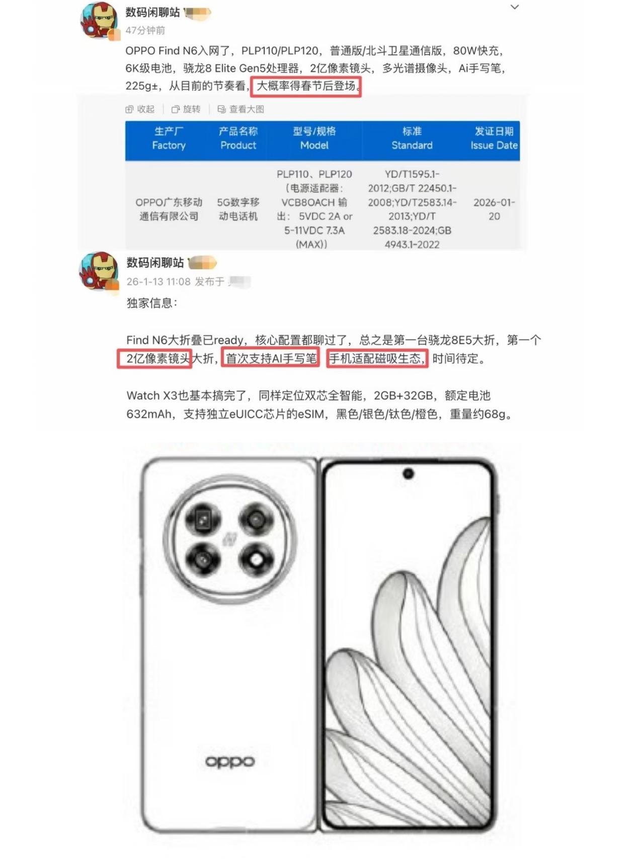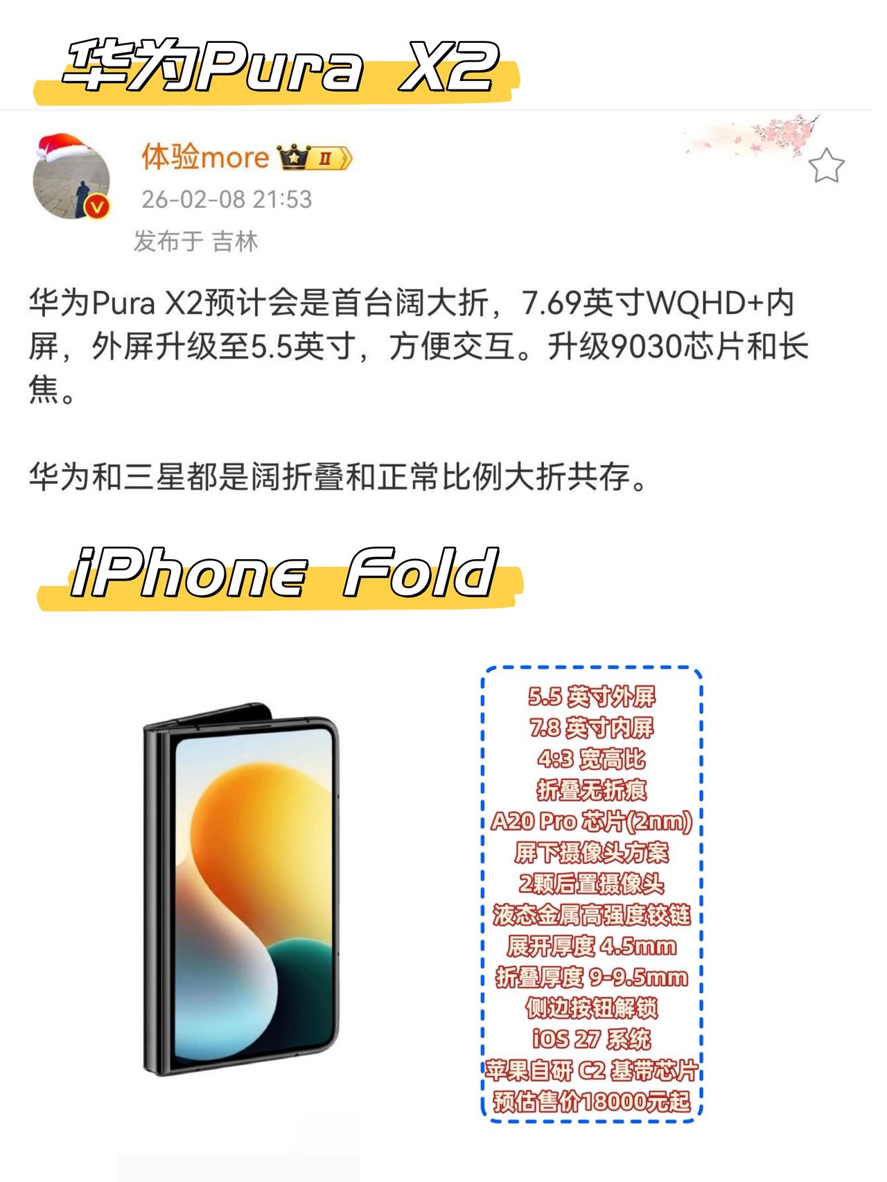 刚买折叠屏的人已哭晕?26年这波技术迭代,老款直接变“老人机” 最近都在跟老家亲戚聚会,好几个朋友问我今年买折叠屏合不合适。我的建议一律是:急也再等等。 不是现在的机器不好,而是今年要上的这批新折叠,几乎全是“跨代升级”。就目前的消息,OPPO Find N6、华为Pura X2、iPhone Fold这几款重磅折叠屏都确定年后上线,换代升级很明显。 首先是关注度最高的——iPhone Fold。要在9月上,5.5英寸外屏+7.7英寸内屏,看爆料无折痕应该是最强的卖点,起售价估计得上2万。就是要等半年,黄花菜都凉了,而且听说折痕供应链这些基本都是照搬OPPO的,一点都不像是苹果的作风啊。 另一个就是我很期待的OPPO Find N6,听说要比苹果提前半年用实现无折痕。据说用上了黑绷带屏幕、液态金属、自修复玻璃三大黑科技,估摸着折痕更浅、机身更抗造、手感更高级,实现视觉无折痕,而且春节后就会上线,着急换机的完全可以蹲一波。 阔折叠华为Pura X2内屏升级到7.6英寸,还是16:10比例,折痕也控制的更好,而且搭载麒麟芯+6000mAh+红枫景图,几乎没短板了。 可以说今年的三款折叠屏各有各的绝活,折叠屏迭代太快,买新不买旧,等新品到手才不亏~ 折叠屏OPPO Find N6