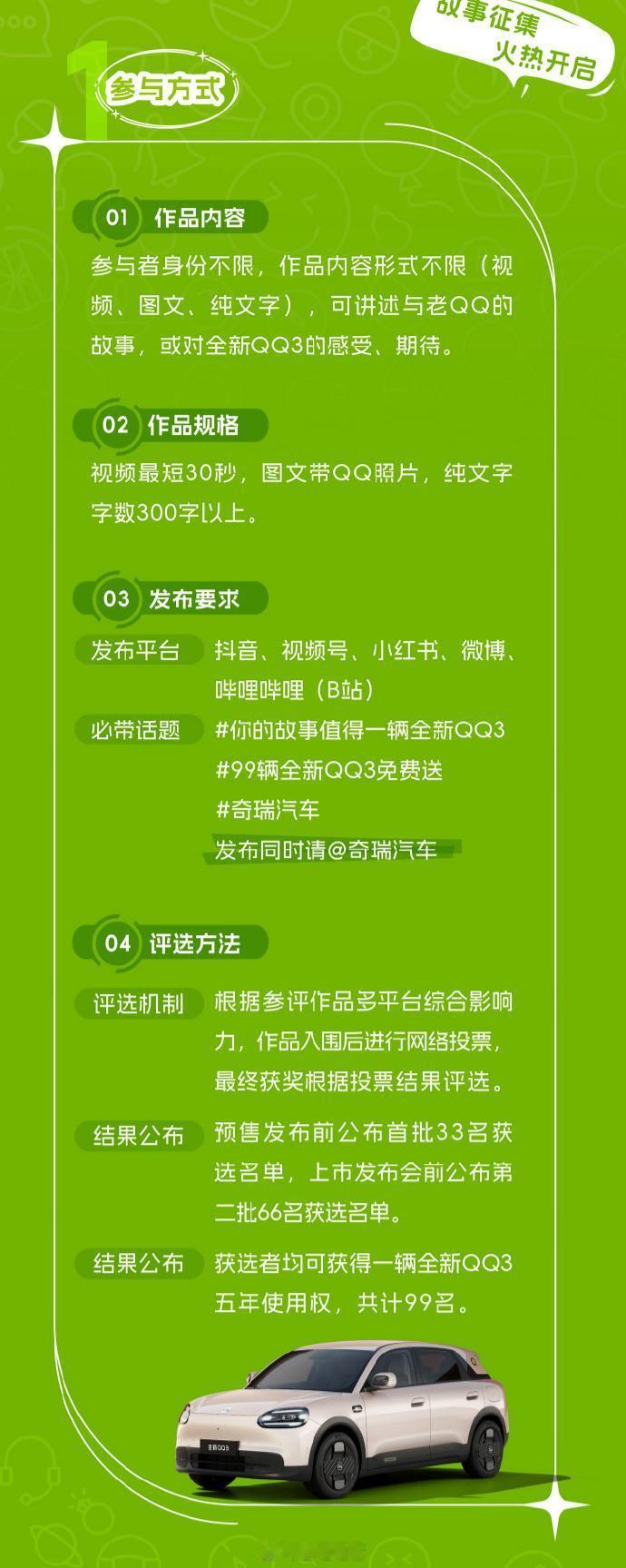 奇瑞全新QQ3免费送 限量99台!?用户只需要讲述老QQ的故事,或者表达一下对于新QQ3的感觉或者期待,就可以参与这个活动了,各种形式都不限。