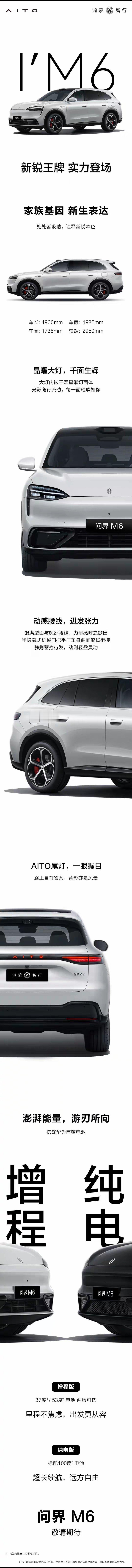 目前,问界汽车官方也发布了 M6 的产品介绍图,新车将搭载华为巨鲸电池,纯电版标配 100 度电池,增程版可选 37 度或 53 度电池。