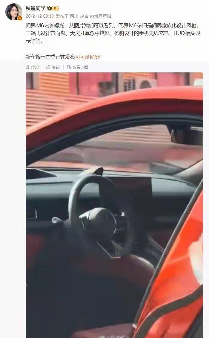 博主 秋晨同学 分享了鸿蒙智行问界 M6 汽车的内饰谍照。画面显示,新车延续家族化设计风格,配备三幅式方向盘、大尺寸悬浮中控屏、倾斜设计的手机无线充电、HUD 抬头显示等,并依旧采用怀挡方案。