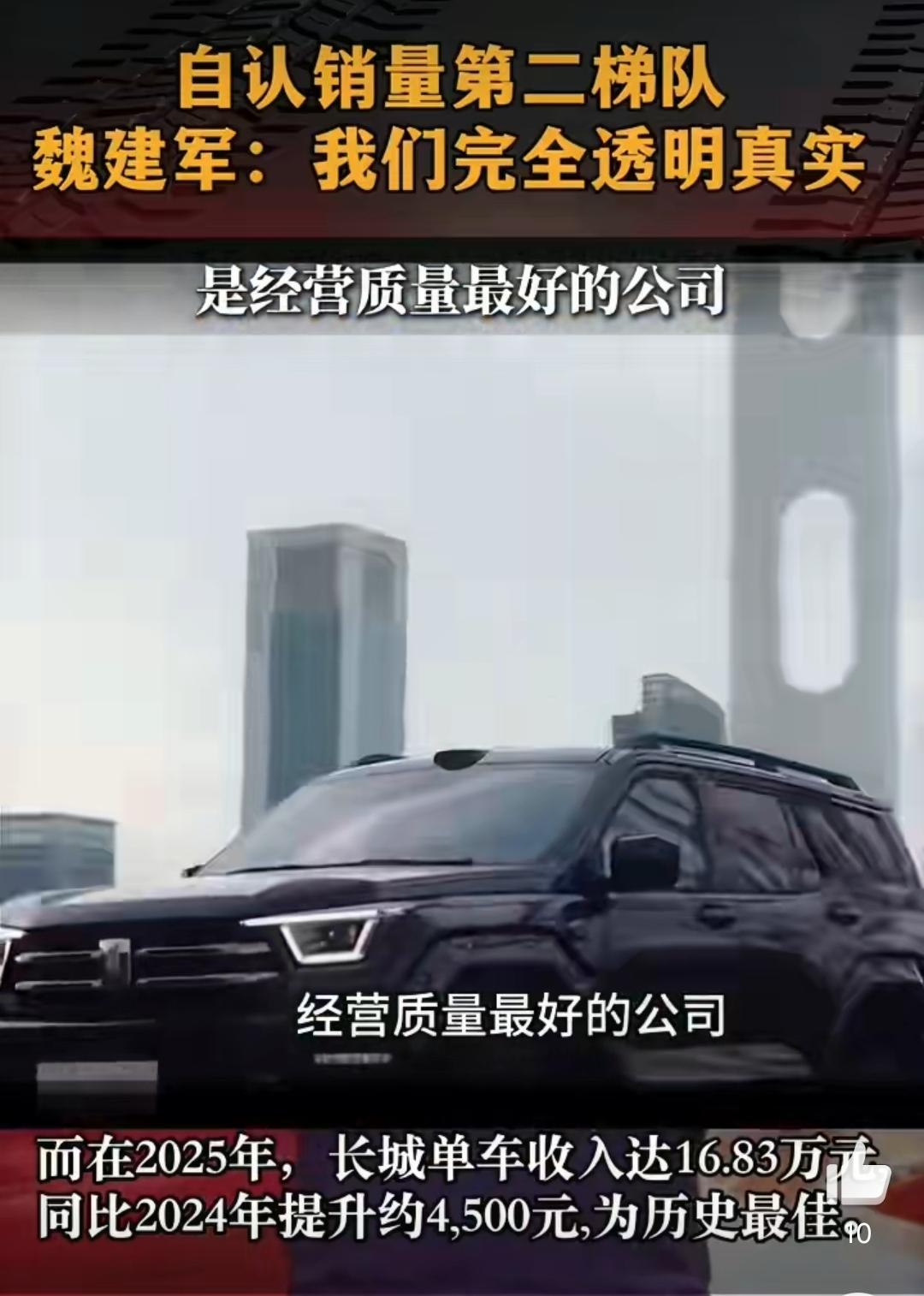长城汽车去年单车收入16.83万元,已超越丰田(16.8万)、超越大众(14.2万),进入合资主流价格带,难怪在长城汽车年会上,魏建军高调发声:长城的销量是第二梯队,看似利润不高,但长城做事真实、透明,可持续发展,是中国汽车公司里经营质量最好的。 各位同意吗?
