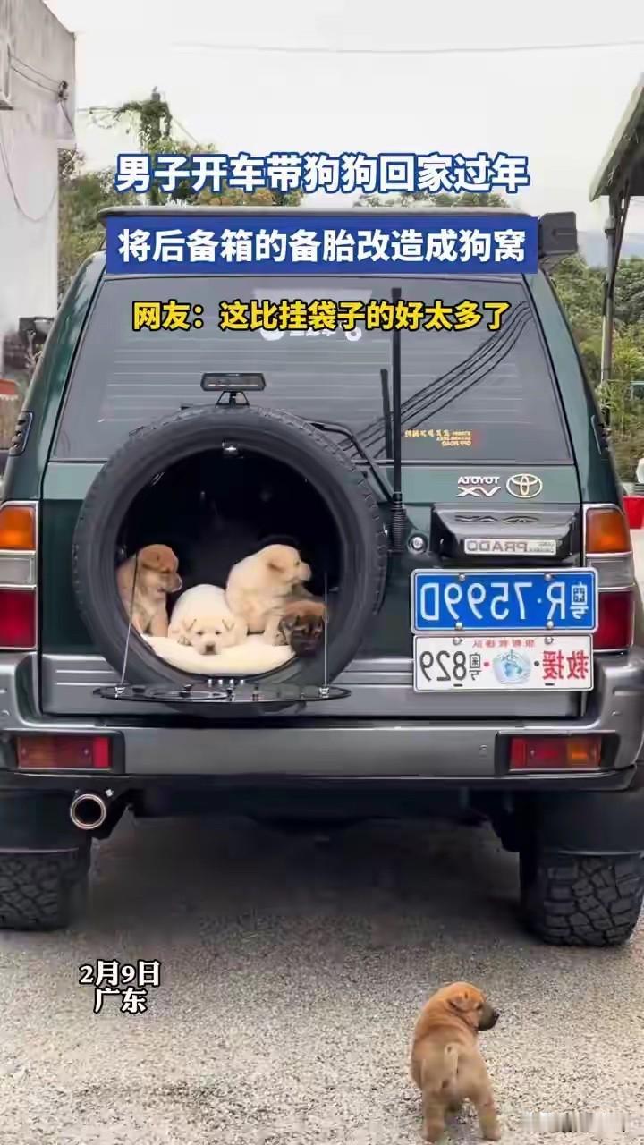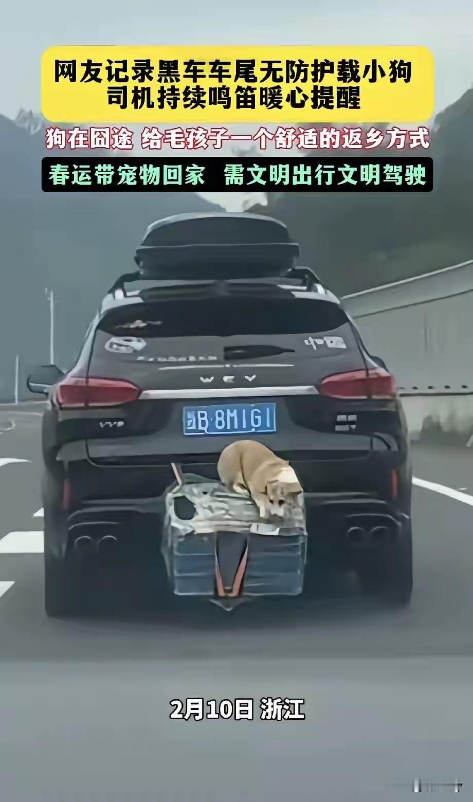 随着春节返乡大潮来临,很多养狗的家庭也是使出了各种绝招!有的狗狗晕车,有的是车里根本坐不下,只能把狗狗放在车外! 看这只可爱的狗狗被主人用袋子装起来用绳子绑在了车尾部,主人怕狗狗冷还给它戴上了一顶帽子! 有网友说狗主人这样做并不是爱狗,如果爱它就应该让它坐在车里边! 别管狗主人爱不爱狗,最起码没有把它遗弃了,没有让它成为流浪狗已经是爱心满满了! 比起那些为了回家把狗狗拉出家门扔在大街上的人已经强很多了!虽然狗狗皱着眉头满脸的不高兴,但能跟着主人一起回老家也是一件快乐的事!