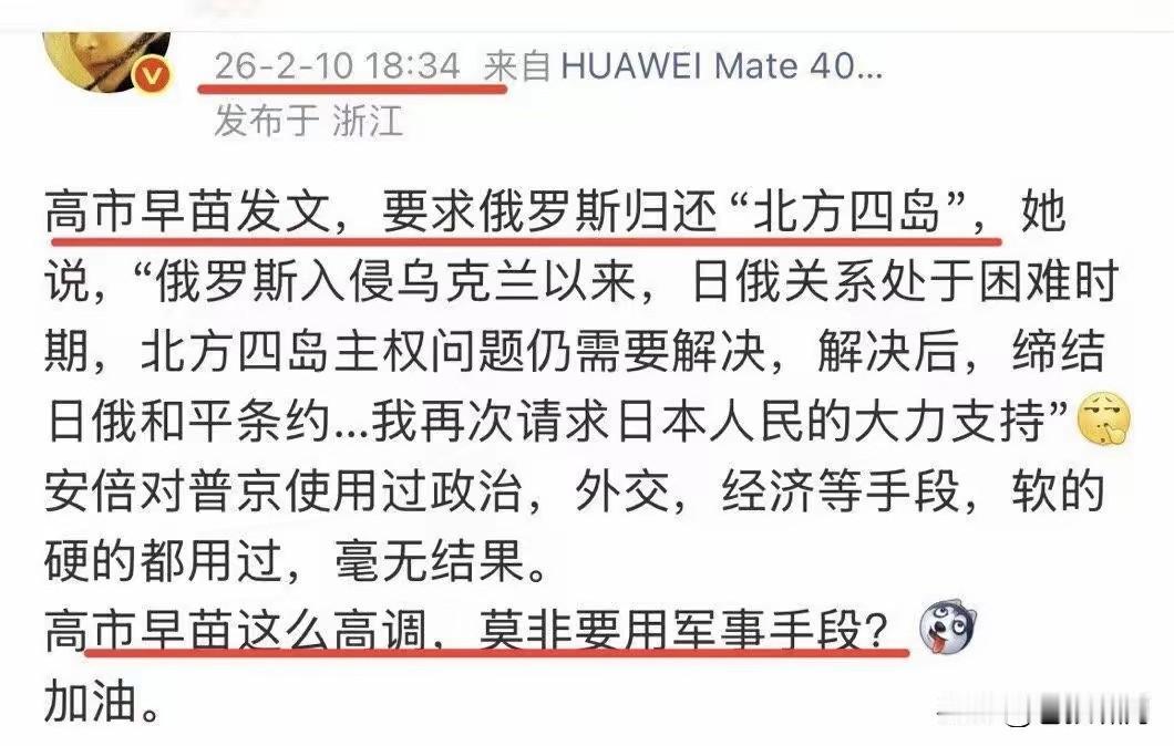 高市发文,要求俄归还“北方四岛”!这是一个新动向。她说俄乌战争以来,日俄关系陷入困难。北方四岛主权也需要解决,解决后日俄签订和平条约! 此番言论何意?可能有以下几点: 1.高市说俄乌战争,使日俄关系出现困难!是什么意思?暗指俄发动战争,日本大力援乌,是占据道义高度? 2.她看到俄乌战争有希望停战,实现俄乌和平!于是便想到北方四岛,也想解决历史遗留问题,让其回归日本? 3.记得安倍时期,曾想收回北方四岛,政治经济外交手段都用过,却未能实现目标。高市这次重提,是否想借俄乌战争机会,武力解决北方四岛问题? 苍狼觉得此时,如果高市出兵,解决北方四岛问题,或许真能拿回来?但又觉得不可能,因为俄拥有千枚核弹,惹急了“再扔两颗”,日本如何受得了? 但日本政治精英,不会忘记北方四岛!无论什么时候,一定会用各种方式,解决这个问题。现在解决不了,是因为军力不强大?没有航母核武器吗? 最近高市向川普流露,日本要搞核武!川普竟然同意了。什么意思?是因朝鲜有核武,日本也应该有吗?但日本是二战“战败国”,不能拥有核武吧? 但若有老美支持,这事也不是不可能!日本有技术,航母核武都不在话下。如高市发狠要搞,估计手到擒来。关键看国际如何应对?这事太复杂了! …………