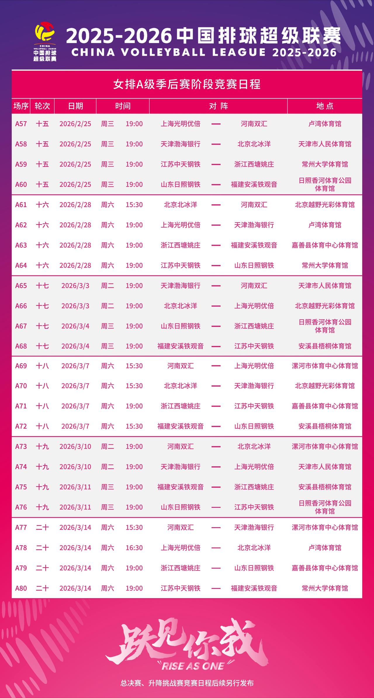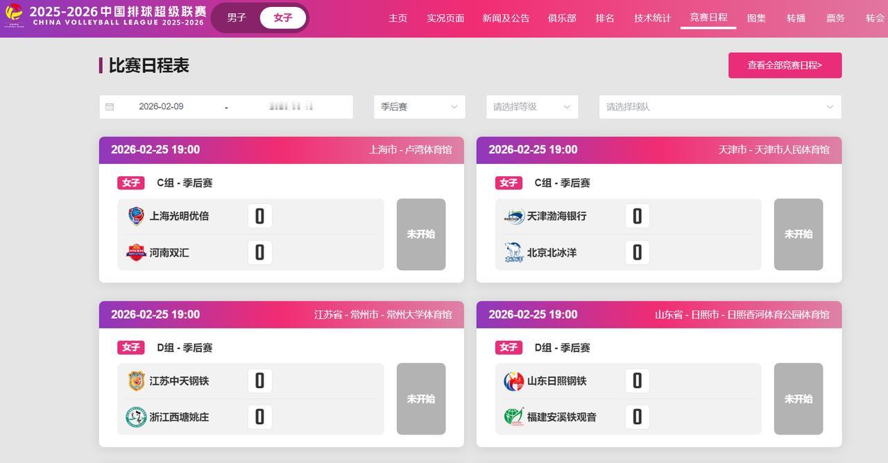 【女排联赛A级别季后赛赛程出炉】 中国女排超级联赛季后赛2月25号打响 C组:上海、北京、天津、河南 D组:江苏、山东、福建、浙江 首轮江苏就在主场对阵升班马浙江队 张常宁、龚翔宇、刁琳宇、吴晗 几位老将还在名单内 只是没拍宣传照 估计只有小宇能坚持打联赛