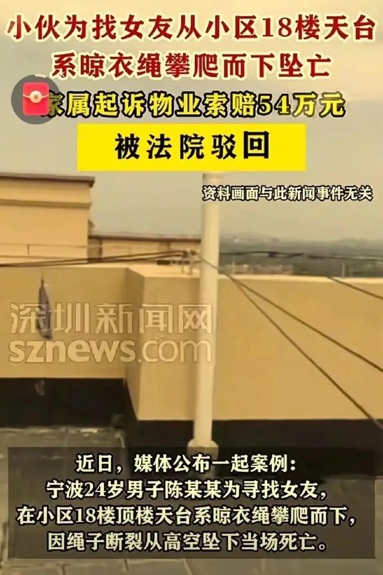太令人震惊了!浙江宁波一名24岁小伙,为了找女友竟从18楼天台系晾衣绳往下攀爬,结果不幸坠亡,家属还起诉物业索赔54万,这究竟是怎么回事呢? 据了解,这名小伙为了寻找女友,竟然想出了这样一个惊险的办法,从小区18楼的天台系上晾衣绳往下攀爬。然而,不幸的是,他在攀爬过程中坠落身亡。事后,家属认为物业没有尽到安全义务,因为阳台门没有锁,导致小伙有机会进行这样的危险行为,因此将物业告上法庭,索赔54万元。然而,物业却表示十分懵逼,他们认为小伙的行为完全是自己的冒险行为,与物业无关。经过法院审理,最终驳回了原告的全部诉讼请求。这一判决结果一出,舆论瞬间炸锅。有人认为,小伙作为成年人,应该为自己的愚蠢冲动买单,不能因为死亡就无理取闹地要求赔偿。否则,社会的规则和秩序将会受到严重冲击。 这起案件再次提醒我们,成年人要为自己的行为负责,不能因为一时冲动而做出危险的行为。同时,也希望大家能够理性看待这起事件,不要盲目跟风或者传播不实信息。快来评论区发表你的看法吧!坠楼故事 青年跳楼 跳楼男孩 小伙坠楼