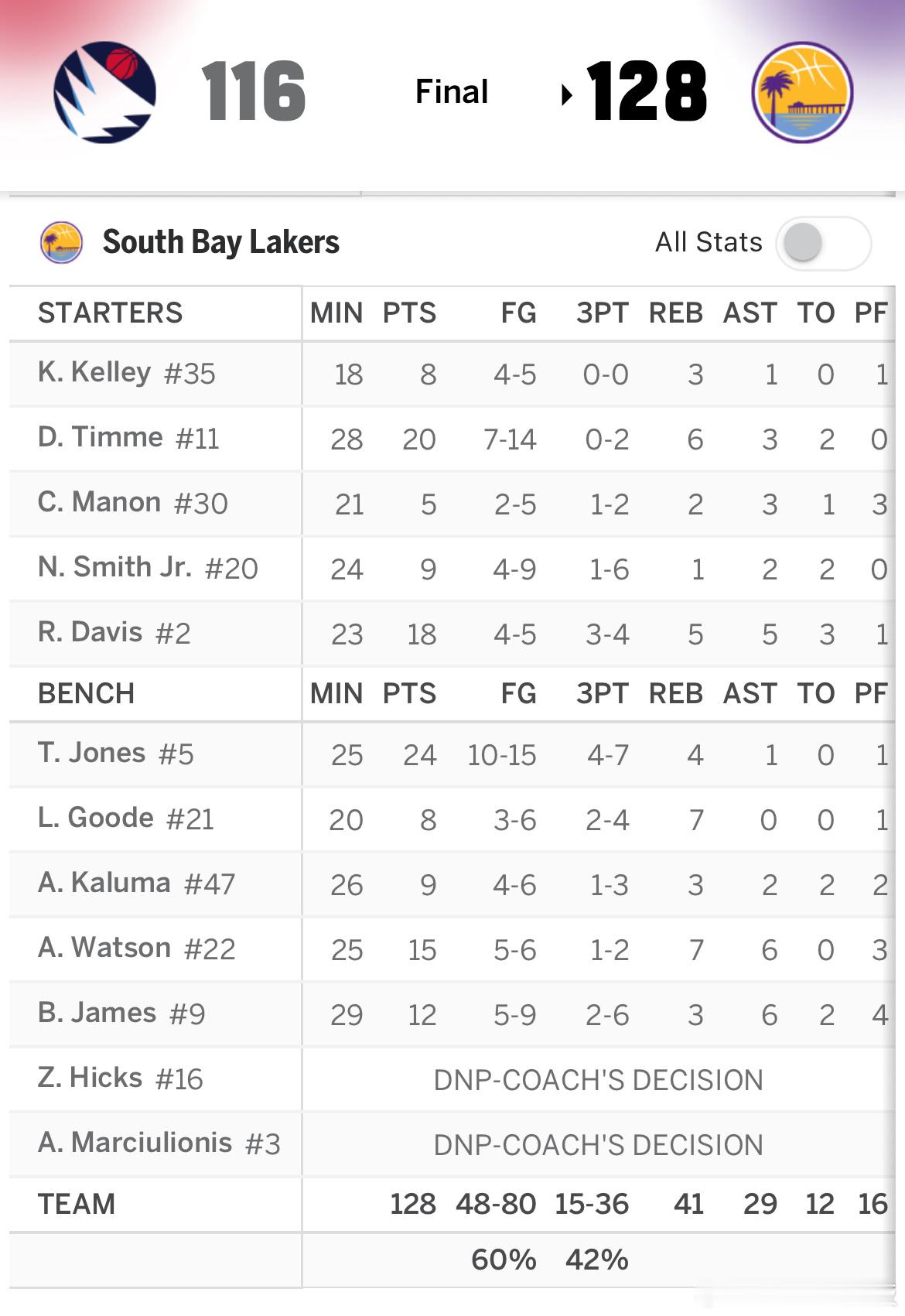 南湾湖人今日128-116战胜快船G联盟球队朱-蒂米20分6板,布朗尼12分3板