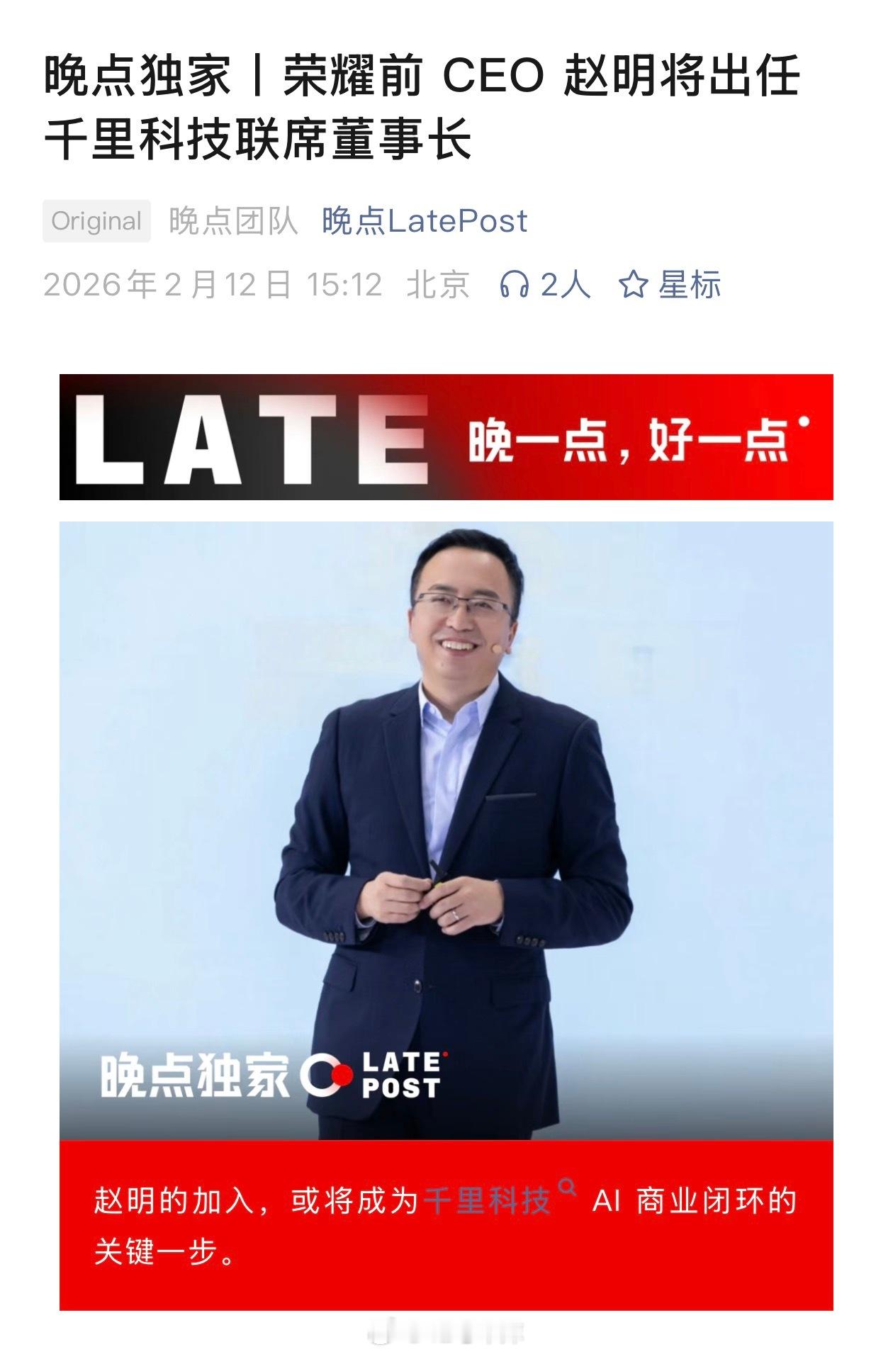 离开荣耀之后,赵明的传言很多,晚点这回报道说,赵明会加入千里科技董事会,任联席董事长。在战略层面,印奇将更侧重于把握 AI 科技的发展战略,赵明则将重点推进 AI 商业模式的闭环战略。