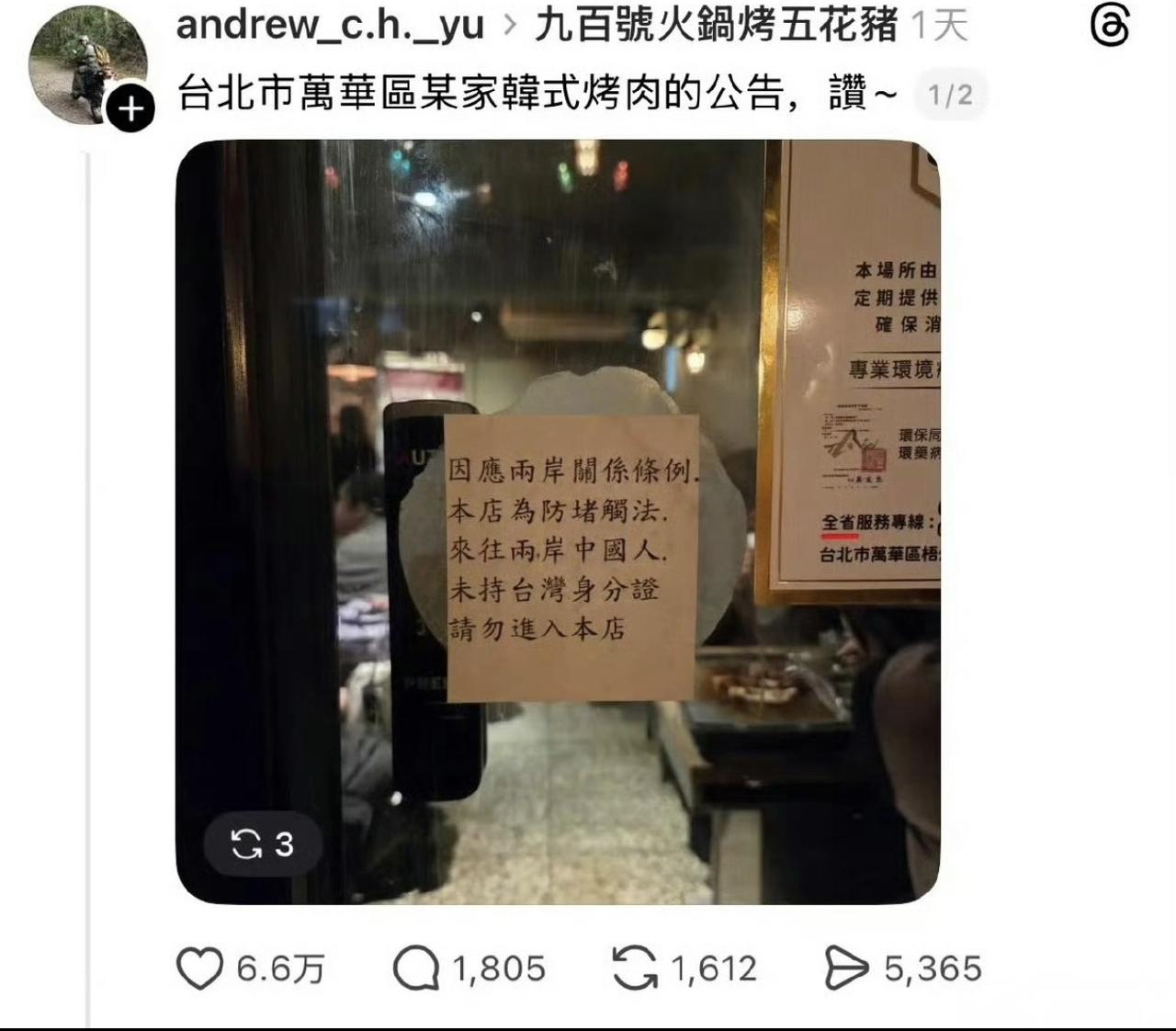 哈哈哈哈哈,笑喷了!蛙式幽默,有个台蛙开饭店,门口贴上:禁止没有台湾身份证的中国人进入! 他这个破店,哪个大陆人会去啊,大陆人去台湾的都很少了!回归之前不给它贡献GDP!他这叫找存在感,无人在意,只当笑话!台蛙的脑回路很可笑,可悲! 其实我也在我家门上贴了:禁止没有大陆身份证的台蛙和狗入内![抠鼻][抠鼻][抠鼻][捂脸][捂脸][捂脸][捂脸]