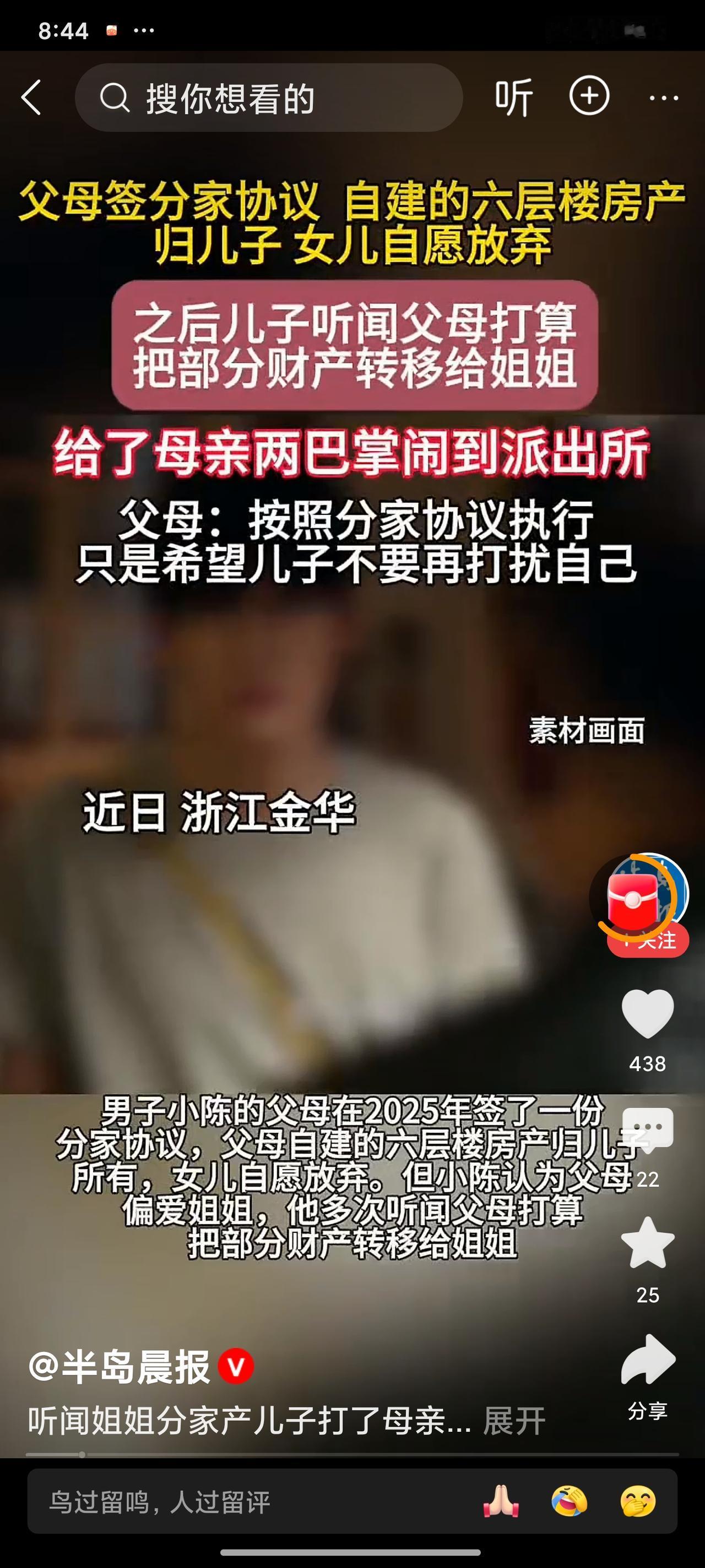 浙江金华男子掌掴生母!6层楼全归他,姐姐自愿放弃,父母寒心却仍履约 养儿防老?浙江金华这一幕,真的让无数网友破防了! 辛苦大半辈子盖起6层楼房的老夫妻,早早签下分家协议,把所有房产都留给儿子,女儿更是大度表态:自愿放弃全部产权! 本是一家和和美美的结局,可儿子却因几句莫须有的闲话,猜忌父母要分房给姐姐,情绪失控下,竟然抬手扇了亲生母亲两巴掌! 更让人意难平的是,被伤透心的父母,依旧选择按协议把房子全给儿子,只提了一个让人心酸的要求... 小陈父母攒了一辈子心血,一砖一瓦盖起6层小楼,就盼着儿女和睦、晚年安稳。2025年一家人坐定签协议,白纸黑字房产全归儿子,姐姐没争没抢,主动放弃继承权,只求亲情不散。 拿到全部房产的小陈,本该感恩父母、善待家人,却偏偏心胸狭隘、疑神疑鬼。听了几句流言就认定父母偏心、姐姐算计,丝毫不念养育之恩,不顾手足之情,一吵架就对母亲大打出手。 两巴掌下去,打碎了几十年的亲情,闹到派出所,好好的家变得鸡飞狗跳! 冷静后的小陈,看着母亲红肿的脸,看着父母绝望的眼神,真的能心安吗? 网友热评炸锅: ❶ “打了爹妈还能独占房产,这儿子真是上辈子修来的‘福气’,父母太卑微了!” ❷ “钱财比亲情重,手足如仇敌,这种自私自利的人,守着房子也过不舒坦!” ❸ “溺子如杀子!从小偏心儿子,最后换来巴掌伺候,家风真的太重要了!” ❹ “姐姐自愿放弃够大度了,母亲生养一场挨耳光,看得我眼泪都下来了!” 我的看法: 父母倾尽所有给儿子全部家产,已是极致的偏爱;姐姐主动退让,是难得的大度。可小陈却把亲情当理所应当,因猜忌行不孝之事,实在令人齿冷! 《民法典》都倡导树立优良家风,孝亲敬长是做人的底线。房子是身外之物,亲情才是一辈子的靠山,父母即便寒心仍念骨肉情,这份宽容太让人心疼。 百善孝为先,别让猜忌和贪婪,伤了最爱你的人!