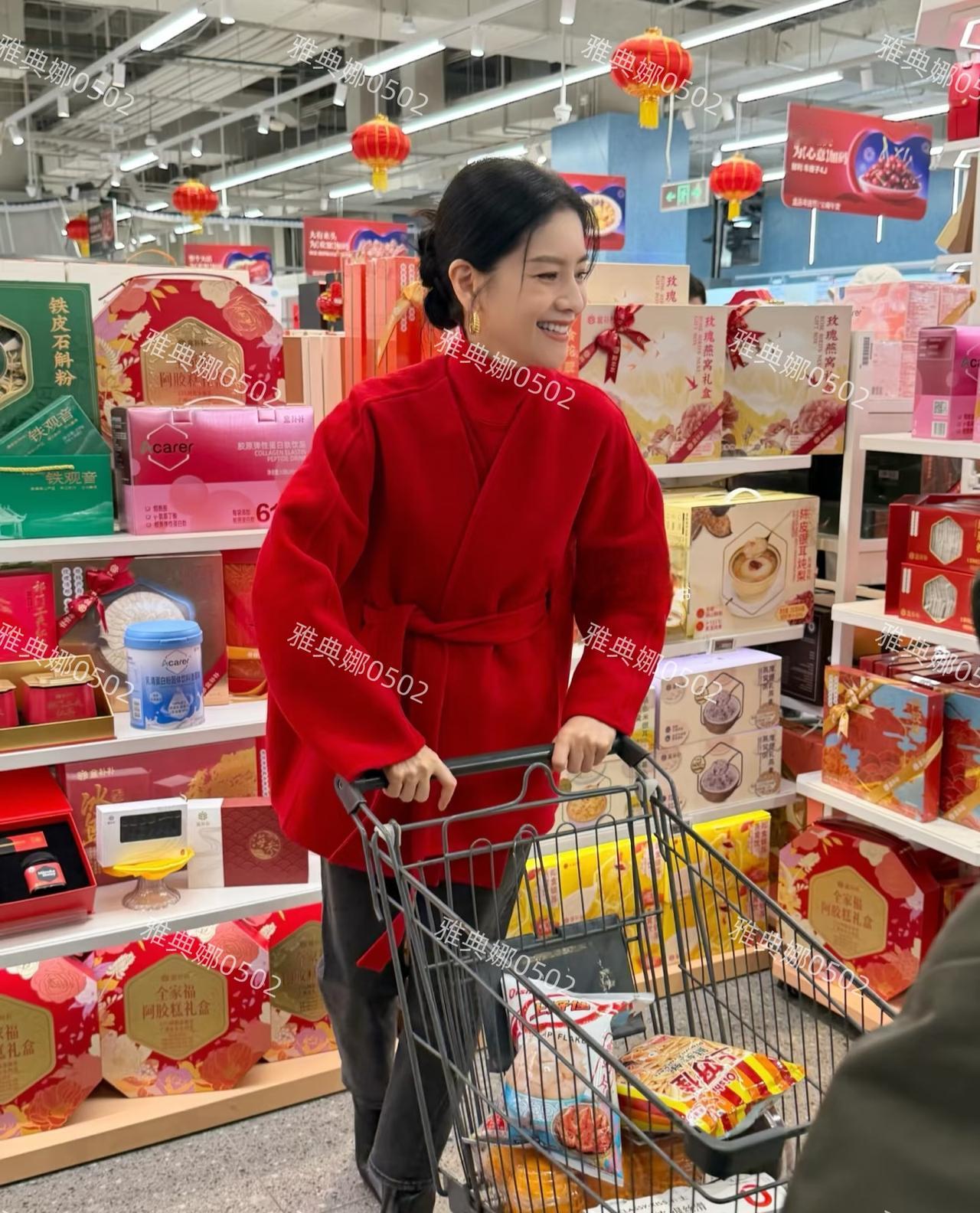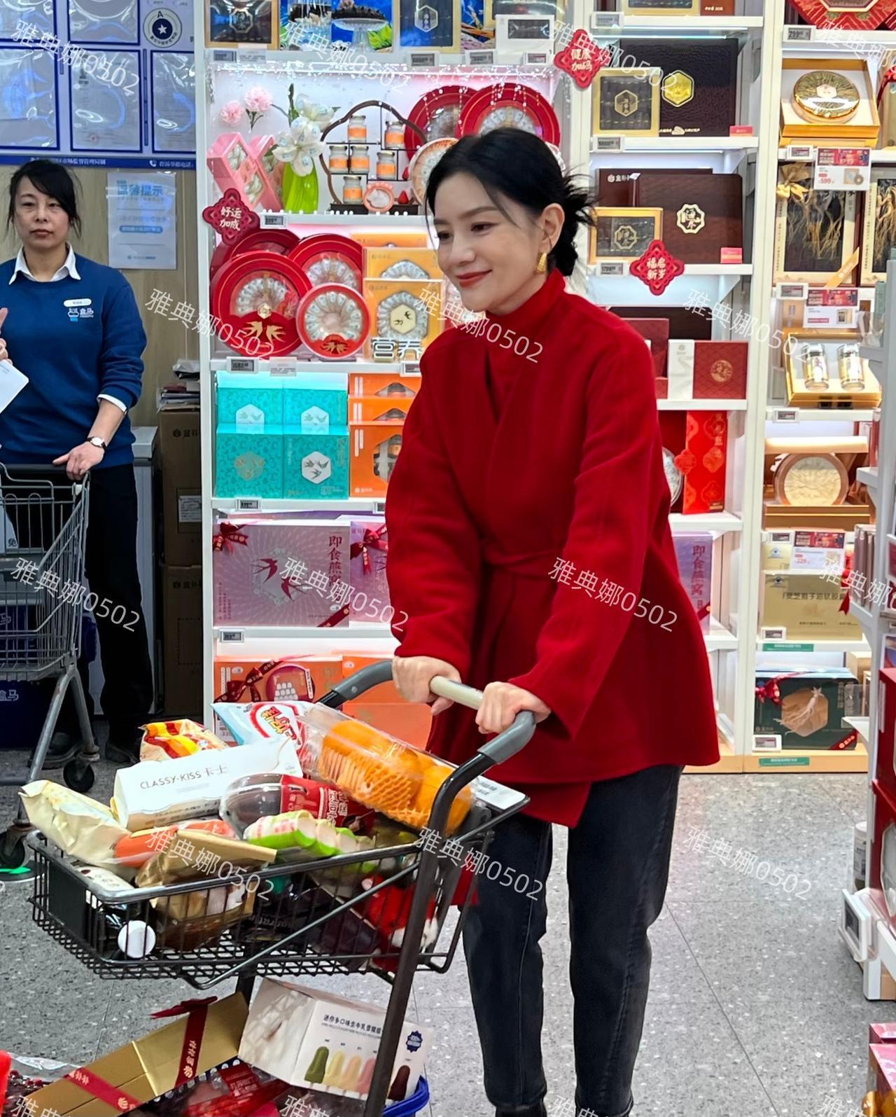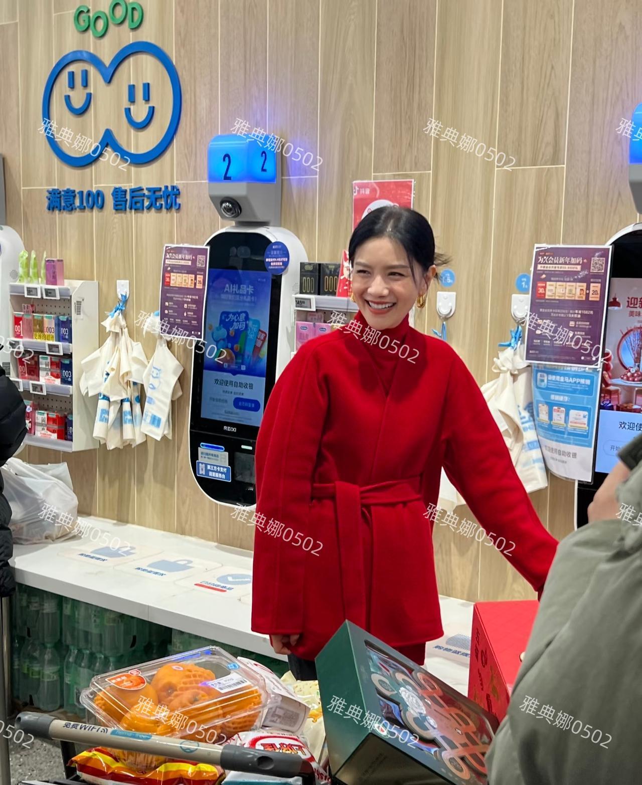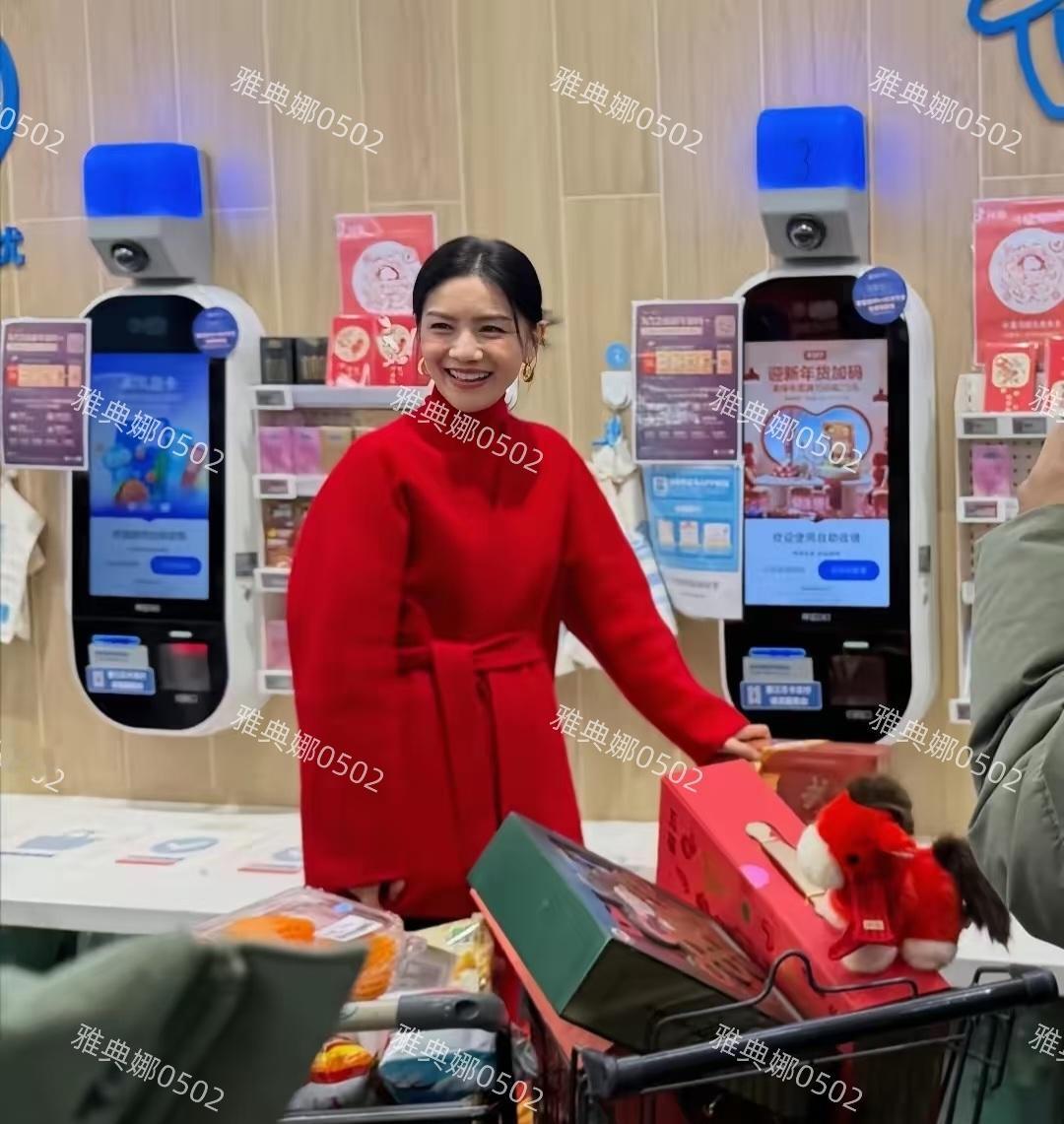 沙溢的老婆胡可本人可真漂亮,她都50岁了真人又瘦又美又年轻,脸上没有一丝科技痕迹,特别自然耐看。 在北京世贸天阶的盒马超市遇到她,她穿了大红色的羊绒衫和大衣,整个人气色特别好,很喜气很有过年气氛,她购物车里装的都是零食,酸奶和各种过年的礼盒,开始以为她是在搞直播录节目她,后来发现她并没有带麦克风,然后推着一车东西到自助收款台结账。