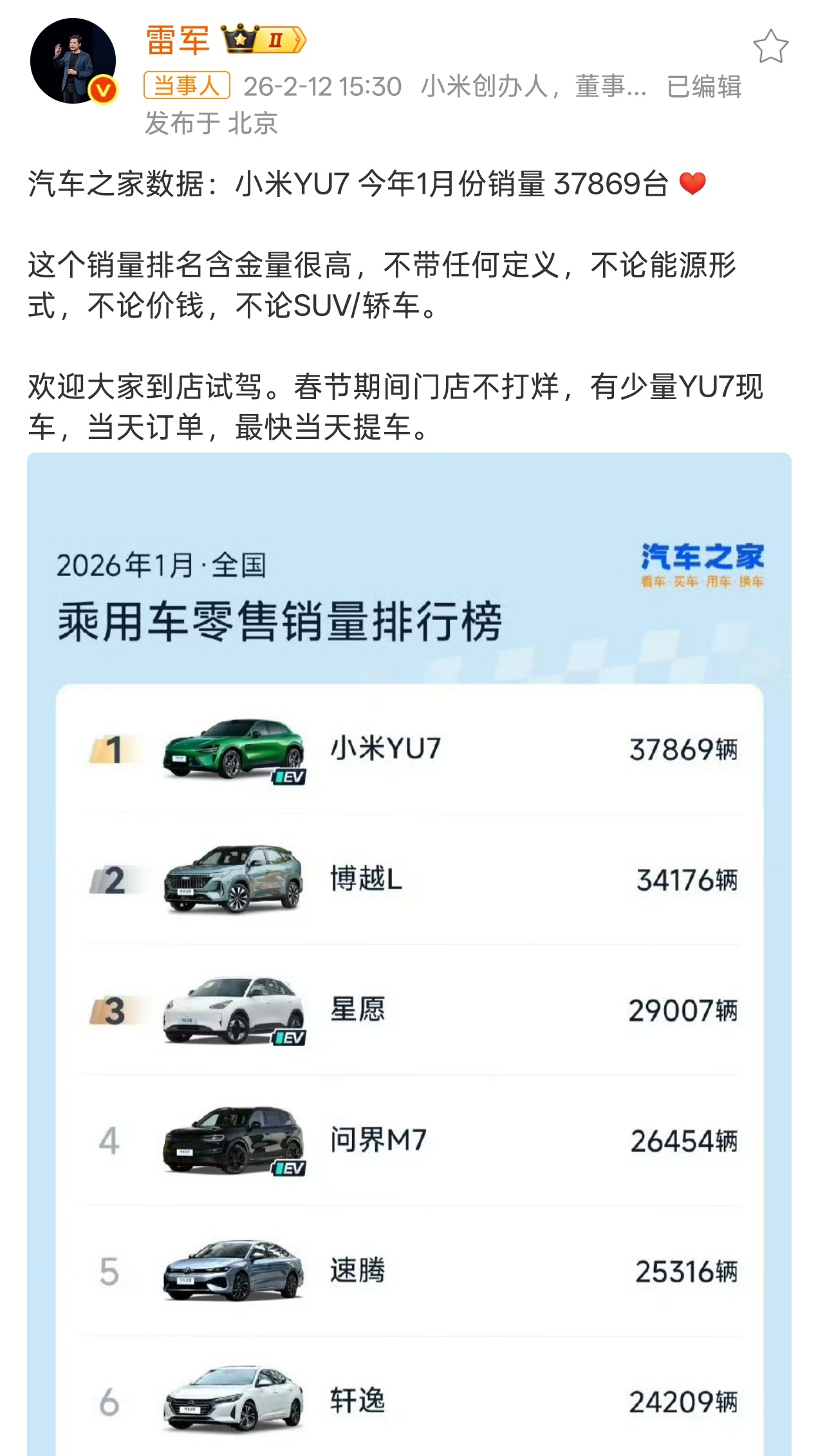 雷军回应YU7登1月销量榜首一辆车一个月卖接近四万,小米真是爆款缔造者,从SU7到YU7出一款火一款。