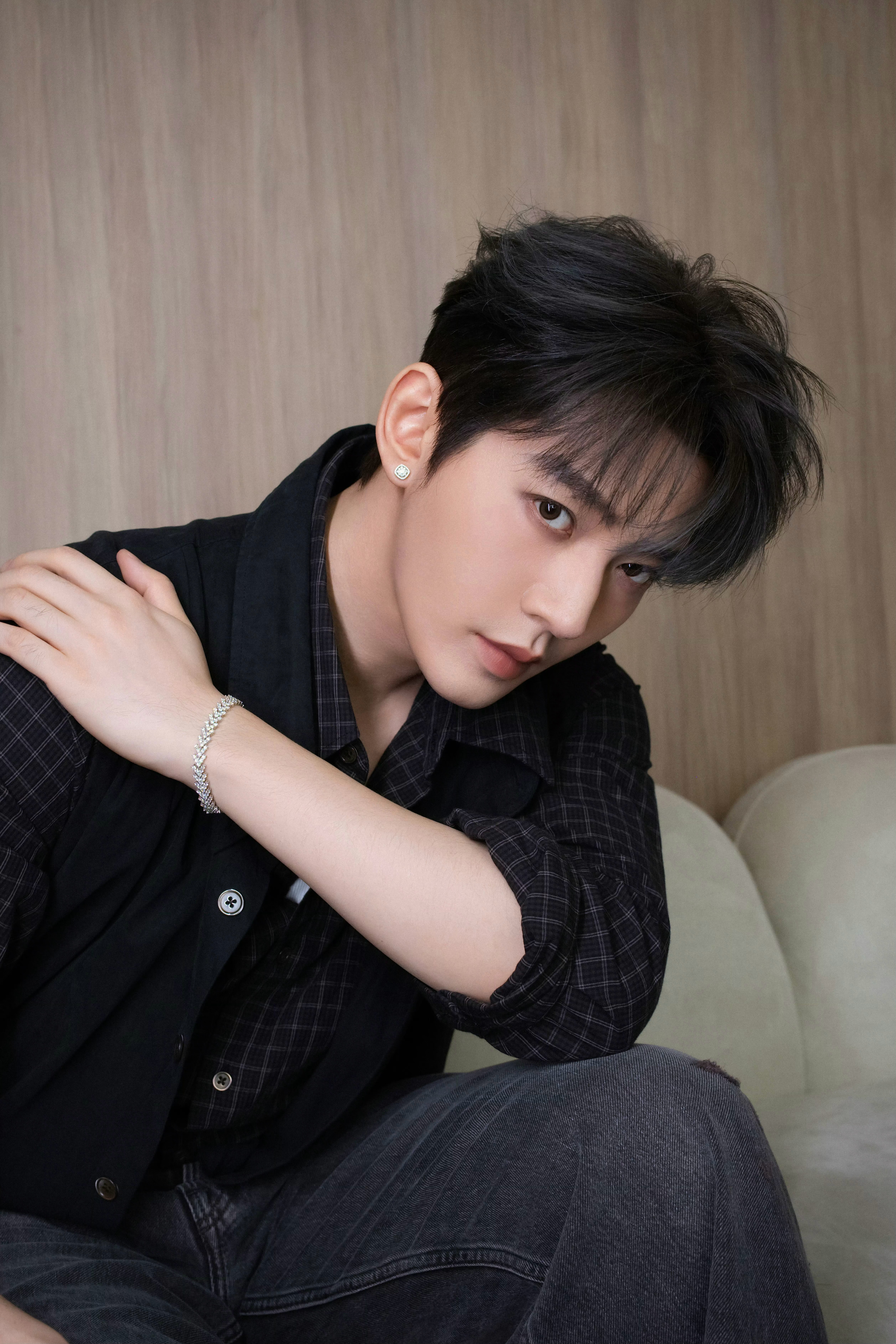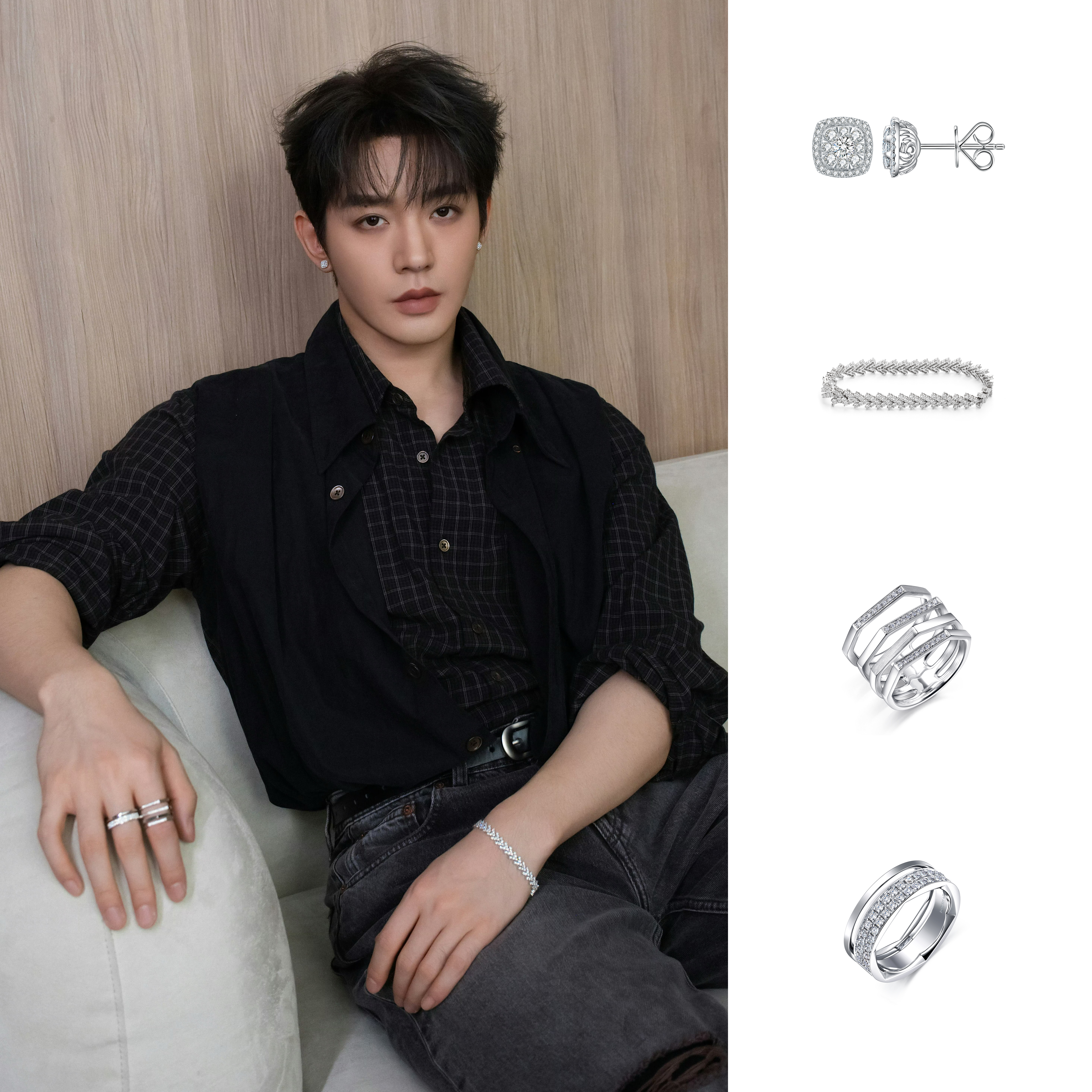 黑衬衫叠穿格纹内搭 ,随性中带着利落锋芒 ,腕间与指间的天然钻石则为整体造型点睛添彩 。灵动 V 形线条手链和白金钻石戒指以几何结构勾勒璀璨光芒 ,方糖耳钉则以经典围镶设计点缀耳畔 ,低调中尽显奢华 ,将天然钻石与少年清冷气质的适配度直接拉满 !