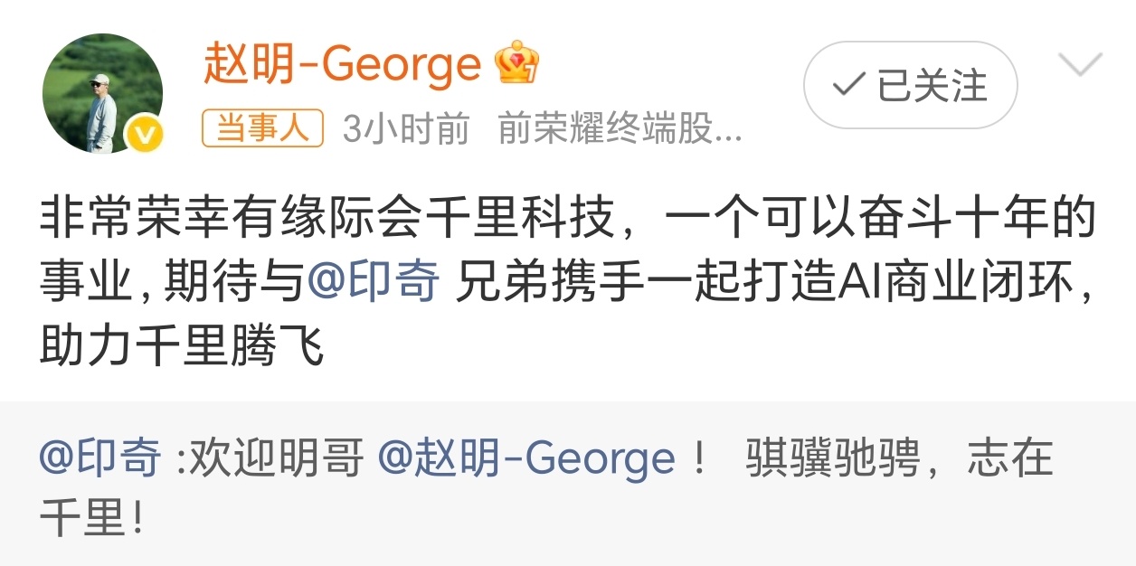 赵明回应加盟千里科技赵明去千里科技了,挺好,吉利在AI领域要起飞了,可期!