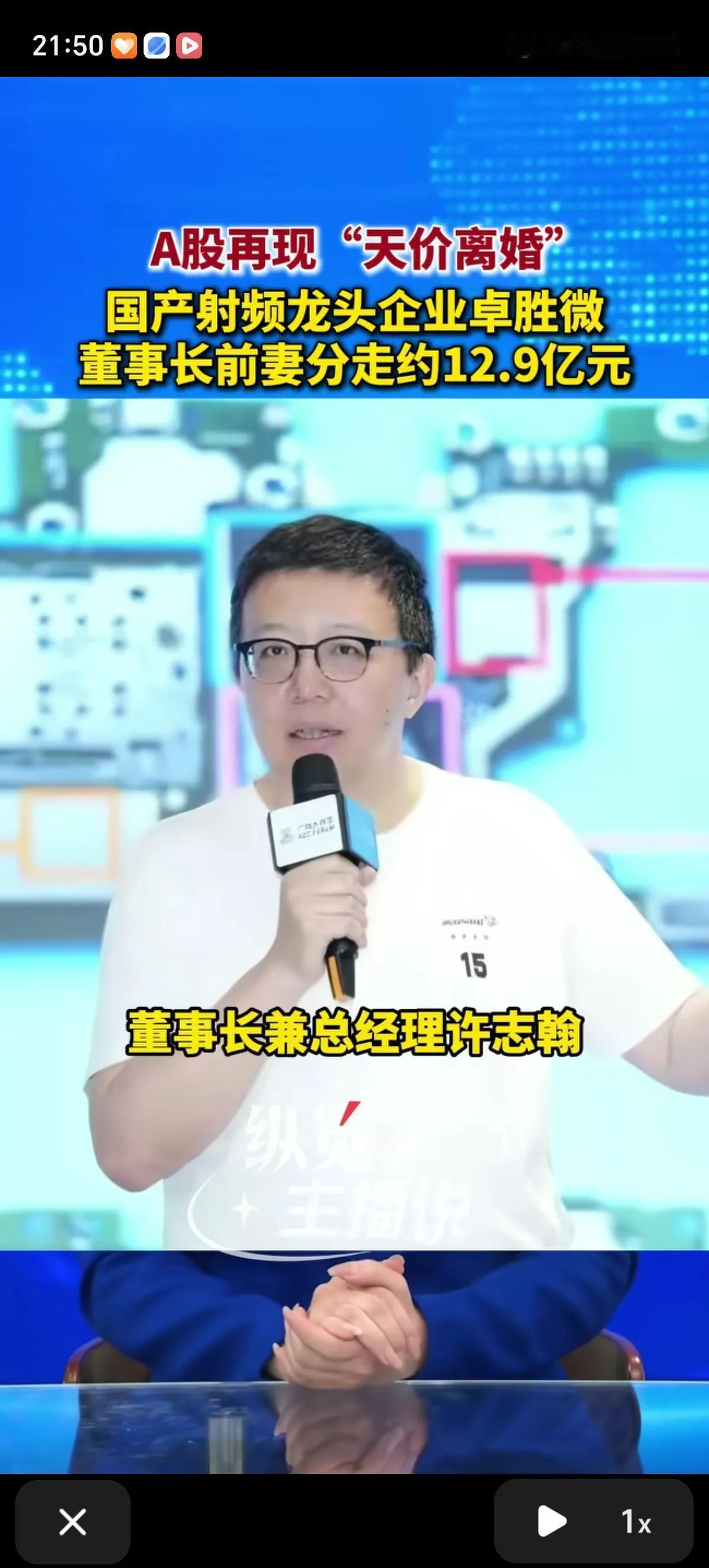 我们在忙着过年,国产射频芯片龙头卓胜微的董事长许志翰在忙着离婚,被前妻分走了约12.96亿元财产,2026年A股的第三起“天价离婚”出现了。 今年2月11日晚上,国产射频芯片龙头卓胜微(300782.SZ)发布公告。公司实际控制人之一、董事长兼总经理许志翰,与前妻张昱解除婚姻关系。 许志翰将其直接持有的1715.2万股卓胜微股份(占公司总股本的3.21%)分割过户给张昱。 以2月11日收盘价75.16元/股计算,这部分股份的市值约为12.9亿元。许志翰的直接持股比例从6.41%降至3.20%,但公司实际控制人未发生变化。 今年1月12日时创能源(688670)发了公告,董事长符黎明与前妻王彦肖离婚,女方分得约4.47亿元的公司股权。 今年1月22日移动通信(603236)发了公告,实控人钱鹏鹤与前妻MINHONG MAO离婚,女方分走约11亿元的公司股份。 卓胜微的董事长许志翰是今年第三个“天价离婚”的。2025年有13个天价离婚的,好奇2026年会有多少起。