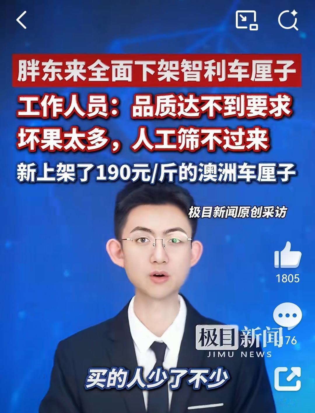 坏果太多胖东来下架全部智利车厘子 临近春节,车厘子异常热销。不过,近期有多名消费者反映,购买到的车厘子出现不同程度坏果。坏果太多胖东来下架全部智利车厘子,胖东来超市因智利车厘子坏果率过高,于2026年2月12日宣布全线下架该产品。 员工解释称,人工筛选坏果成本不划算,因此替换为澳洲和新西兰车厘子,但价格飙升(如澳洲车厘子达190元/斤),导致消费者购买减少。许昌胖东来生活广场超市水果区的一名员工向记者介绍道,此前热销的智利车厘子已经下架了,因为品质不达标,坏果比较多,如果用人工挨个筛选又浪费人力,所以就暂停采购智利车厘子了。 该员工进一步表示,目前超市正在售卖的车厘子是澳洲的和新西兰的,二者价格相较智利有所提高,比如2斤礼盒装的澳洲车厘子售价380元,合190元每斤,所以前来购买的消费者也有所减少。 有商户说今年的车厘子把口碑搞坏了,味道不对,颜色也怪怪的。我们这里卖精品水果的店家这两个月都不卖车厘子了。 中国果树研究院仵生辉教授在10年前就提倡连季种植法每月都有车厘子上市,国内一直没有大面积推广。众所周知,车厘子上市时价格每斤不超过10元,现在190元买保鲜处理过的也没有了。 资料显示,车厘子这种树在全国均可种植,受温度影响较小,国内种苗大多来自烟台,南方更有利于种植,是丘陵山区的理想致富之树,当年种植第二年挂果,第三年收回成本,创业首选。
