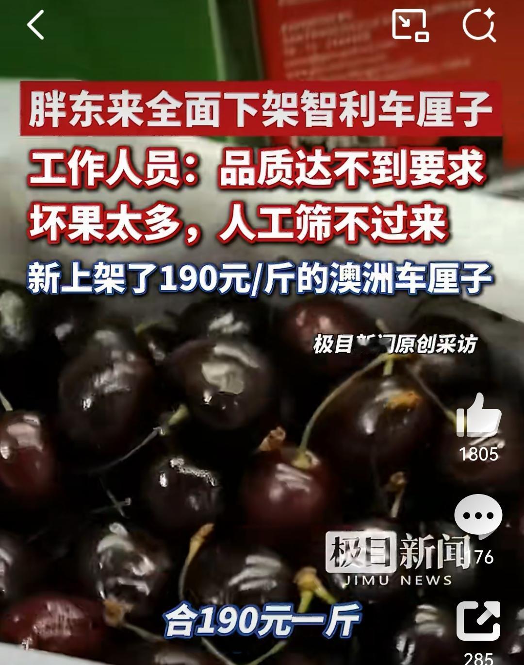 坏果太多胖东来下架全部智利车厘子 临近春节,车厘子异常热销。不过,近期有多名消