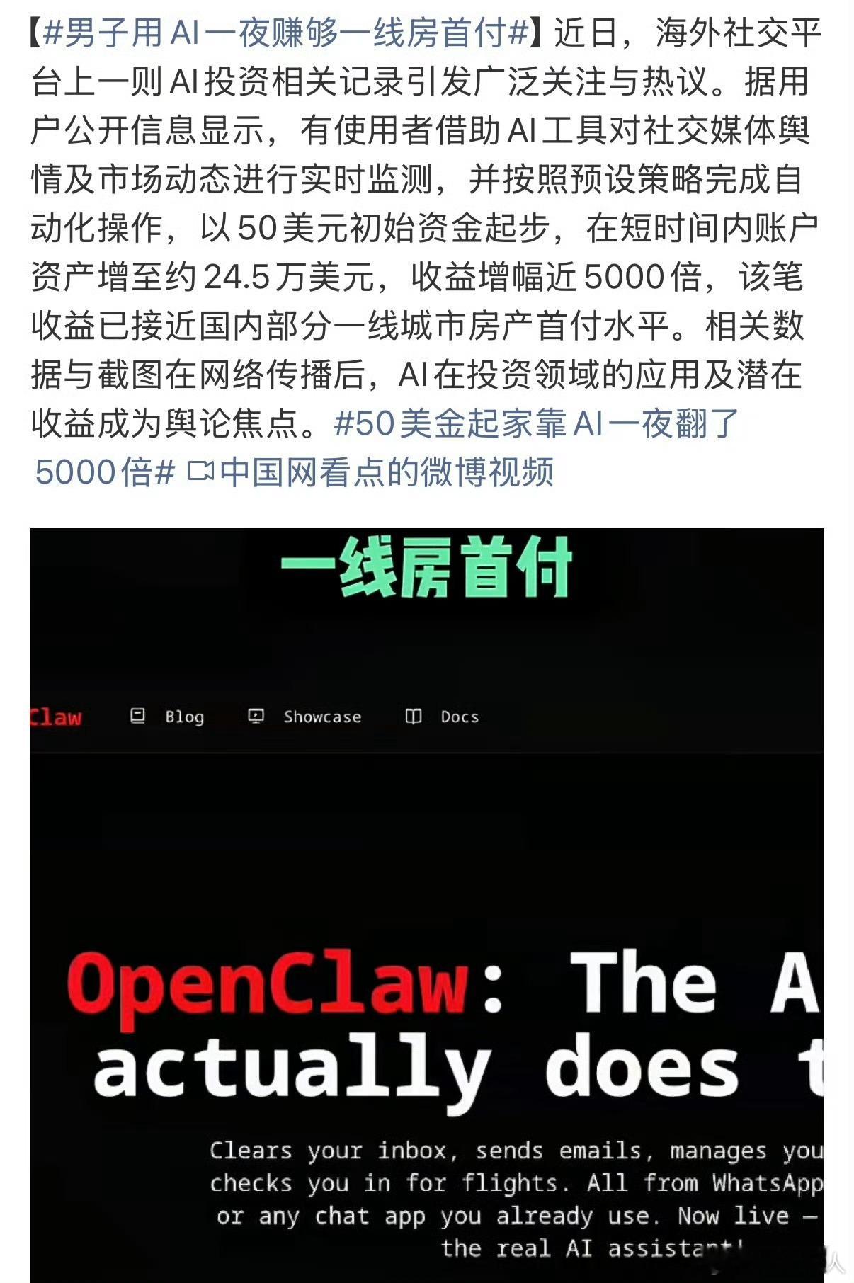 男子用AI一夜赚够一线房首付冷静点,看到这种上头了很容易被骗!先不说这个极端案例的真实性,都是媒体一传十传进来的,连个交易记录的图都没有,全是不相干的配图和视频,AI确实很强大也是风口,这个毫无疑问,但是目前来看还是效率工具,对有操盘经验的人来说是事半功倍了,但投机赚钱还是有风险的,价值投资的核心仍然是长期主义,风险和收益并存也是基本规律,所以心态平和,在自己擅长的领域深耕,低门槛高收益的吹AI 就是让你买AI课的AI