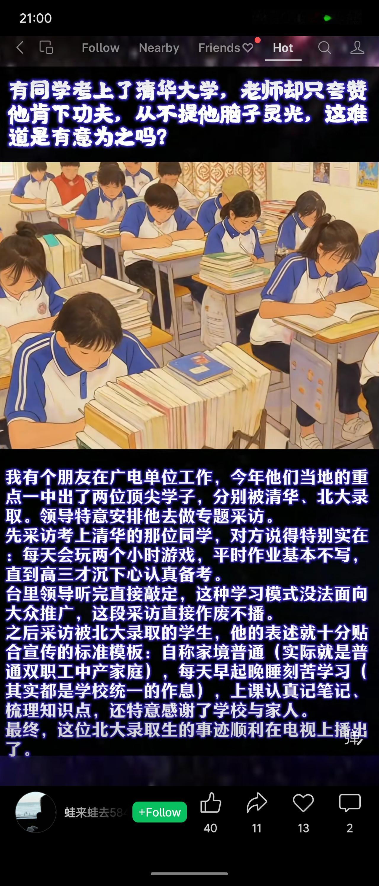 清华生受访自述每天玩游戏、不写作业,采访被毙;北大生按“家境普通、刻苦早起”模板作答,顺利播出。老师只夸其用功不夸聪明——社会推崇苦读叙事,天赋与真实路径反被隐去。
