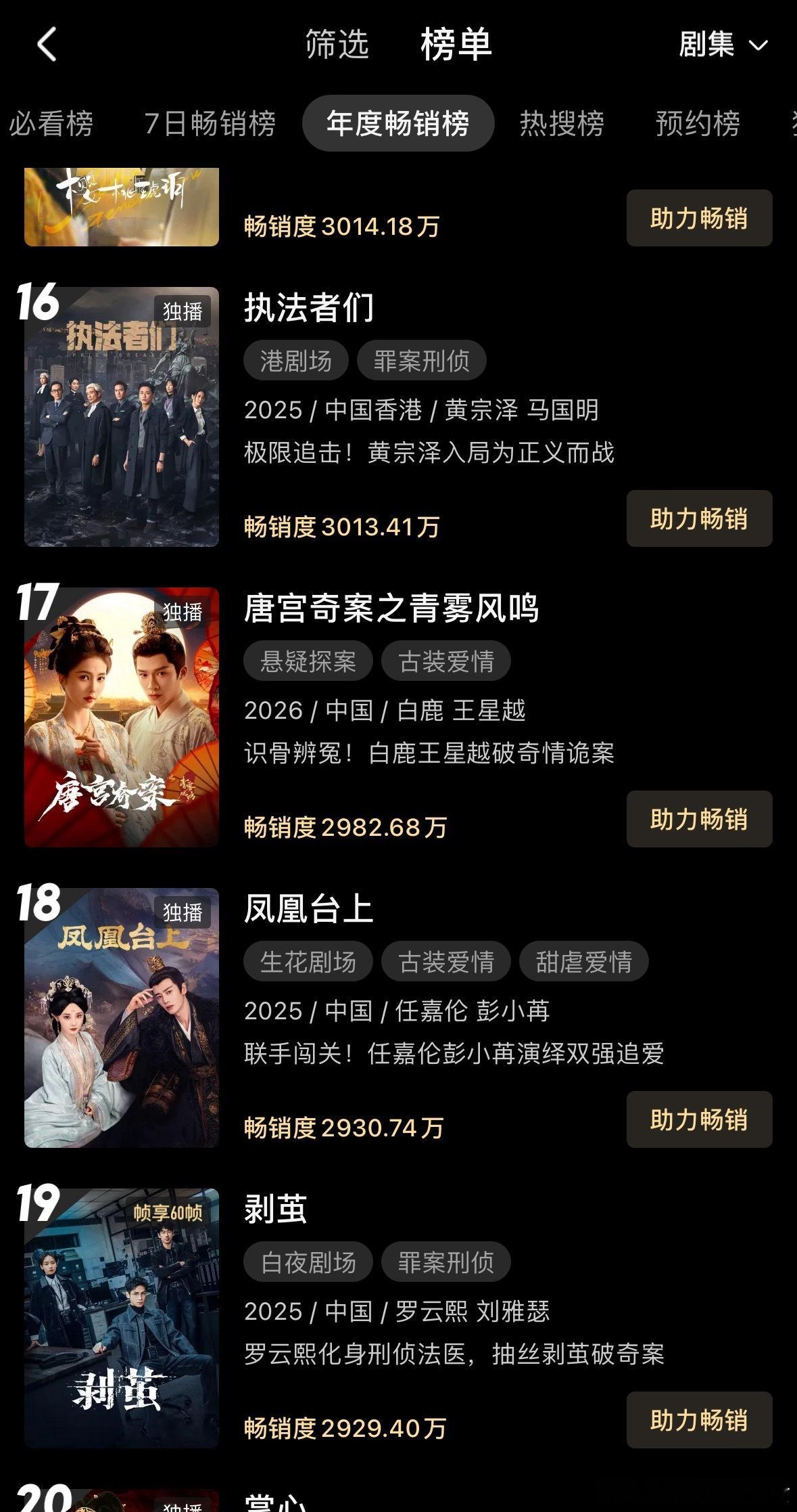 白鹿唐宫奇案畅销年榜第17啦,拉升很快,优酷官方今天又夸《唐宫奇案》夯爆啦,白鹿李佩仪角色也很出圈,位居各大榜单榜一。唐宫奇案目前播到第四案“血色天姿”,前三案分别讲述了“爱情自由,身体自由、精神自由”,是一部真正女性向立意的探案悬疑剧,制作精良,期待接下来的剧情 白鹿我来试试这个新功能