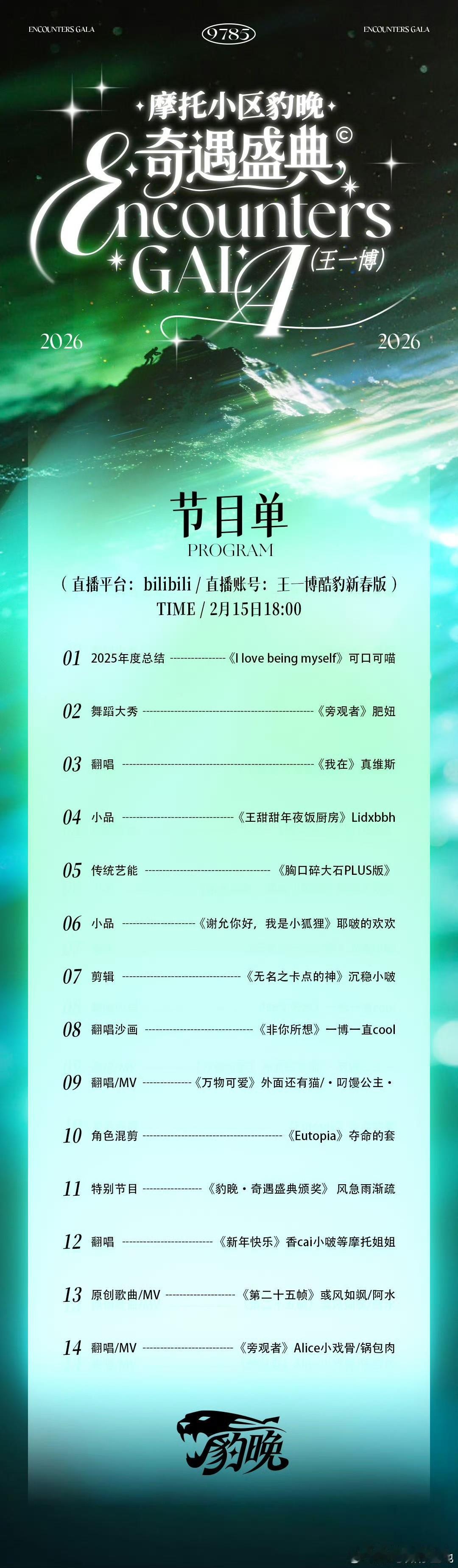 内娱独一家粉丝 有晚会的吧!摩托姐姐和正主一样酷,也太会玩了吧[大金牙] 记得几年前豹晚刚出的时候,黑子说王一博 去不了春晚,粉丝才办的豹晚哈哈哈…… 好消息是,春晚➕豹晚都有,豹晚还有品牌真维斯演出 以下【摩托小区豹晚·奇遇盛典—节目单放送】 期待2月15日晚18:00与大家在小破站准点相见!
