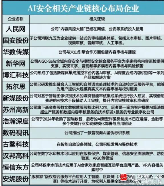 这个会刺激AI内容审核、网络安全概念,今晚吹的比较多。这两个方向位置不高,确实有补涨的预期,节后也有炒作的机会。(爱股君)