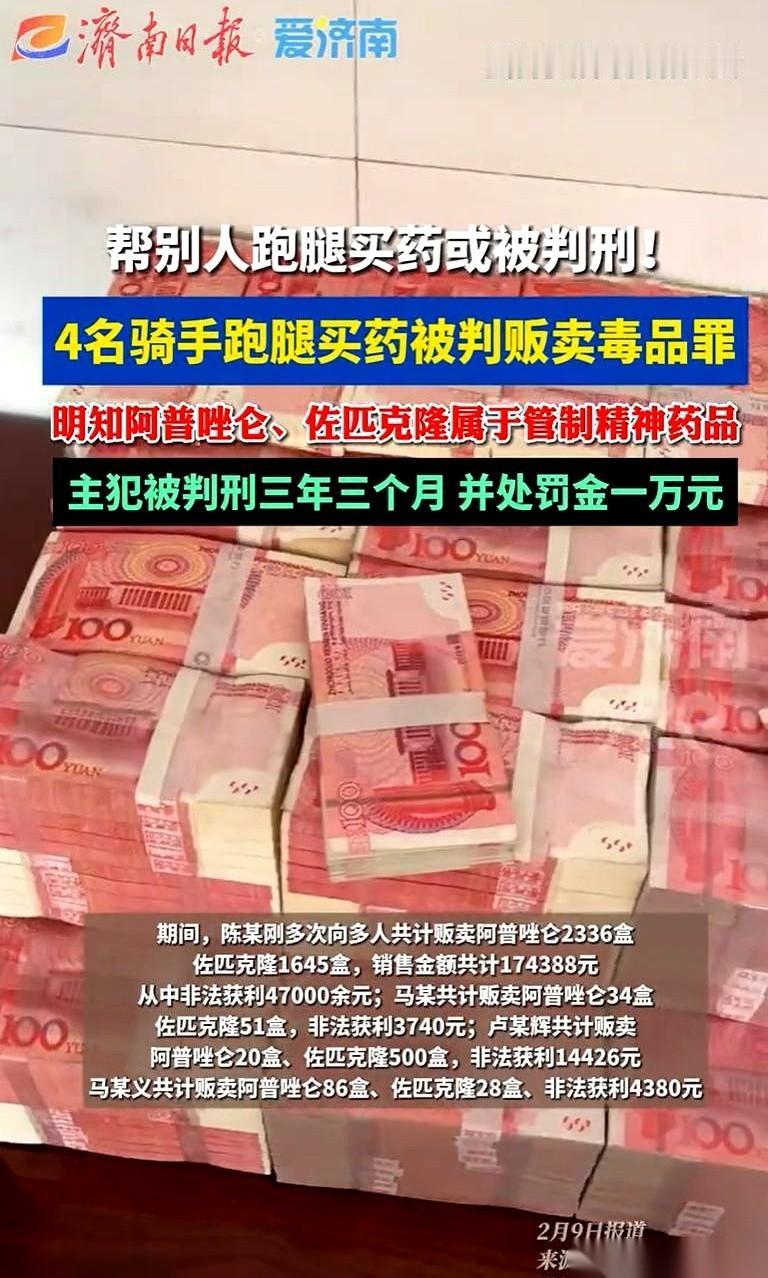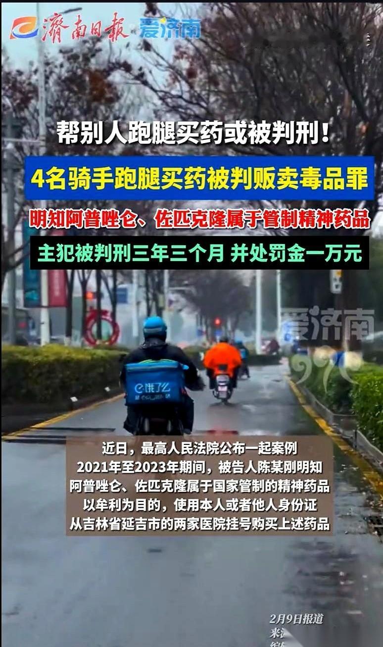 跑个腿,把自己跑成了毒贩子。 你敢信? 就那几个外卖小哥,平时风里来雨里去的,突然有人在群里发个“生意”:用你身份证,去医院开两种安眠药,回来给你远超跑腿费的好几倍。 脑子一热,这不就是代购嘛。 帮人排队买个网红蛋糕,和帮人排队开个药,有啥区别?来钱还快。 于是就去了。一次,两次,成了“稳定供货商”。 他们可能真没想那么多,就觉得是钻了医院管理的空子,赚点辛苦钱。 可问题就出在这两种药上。 阿普唑仑,佐匹克隆。 说白了,这些国家严格管制的精神药品,在法律上,就是“毒品”。你从正规医院把它开出来,再转手卖给别人牟利,这整个行为,就叫“贩卖”。 那个组织收药的头头,是主犯,判了三年多,活该。 可那几个跑腿的小哥呢?也全进去了。 法官说得特别实在:作为一个心智正常的成年人,长期、多次、专门去开远超正常剂量的管制药,还拿着高到不合常理的报酬,你说你不知道这事儿有问题? 骗谁呢。 成年人的世界,早就没有“我不知道”这块免死金牌了。 所有让你觉得“钱来得太容易”的好事,大概率不是好事。那不是馅饼,那是为你量身定做的陷阱,就等你一脚踩进去。