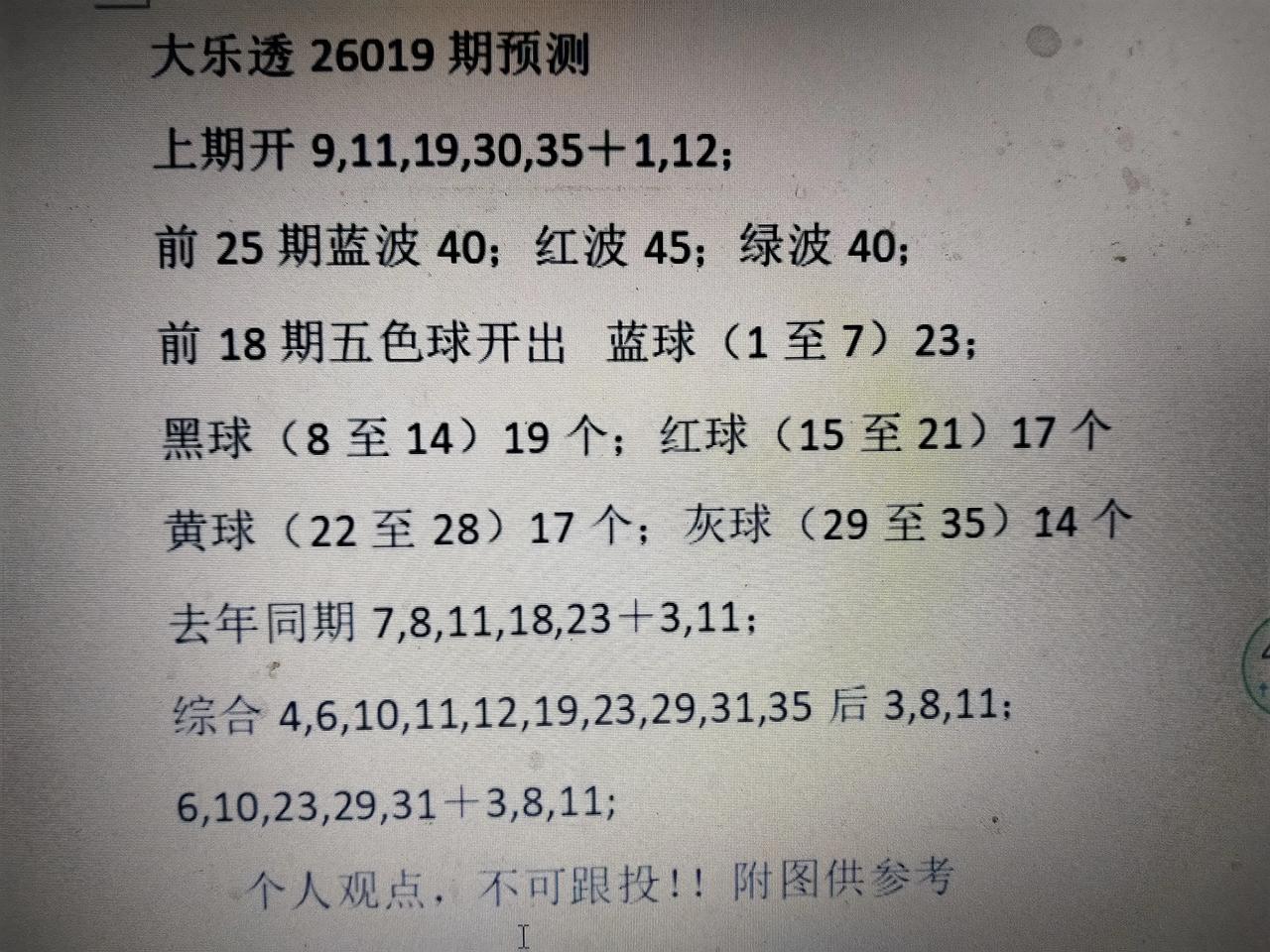 上期前区开出四奇一偶,无蓝球黄球号,本期估计有回补2,4,5,6,22,23,25,28有号开出。 后区上期开出首尾号,也是从1一12月结束号,春节后初八星期三再见。估计2,5,8,11。有号开出。
