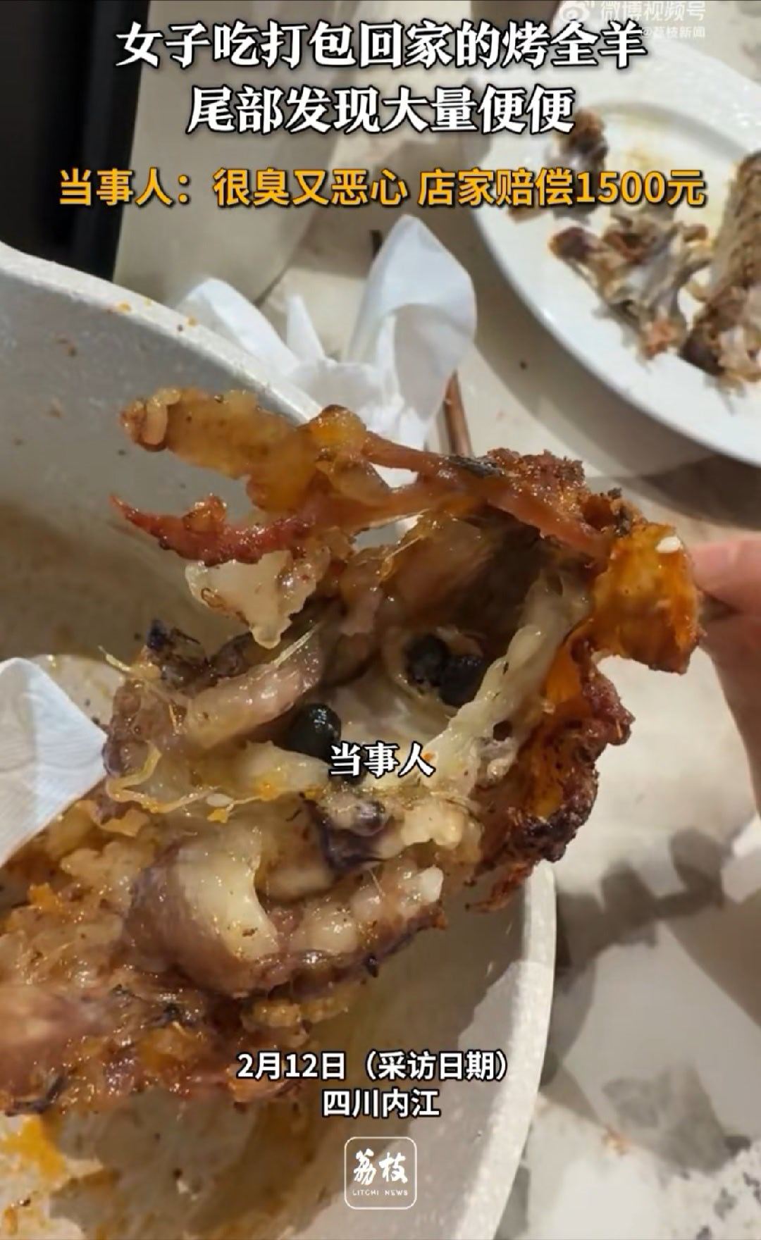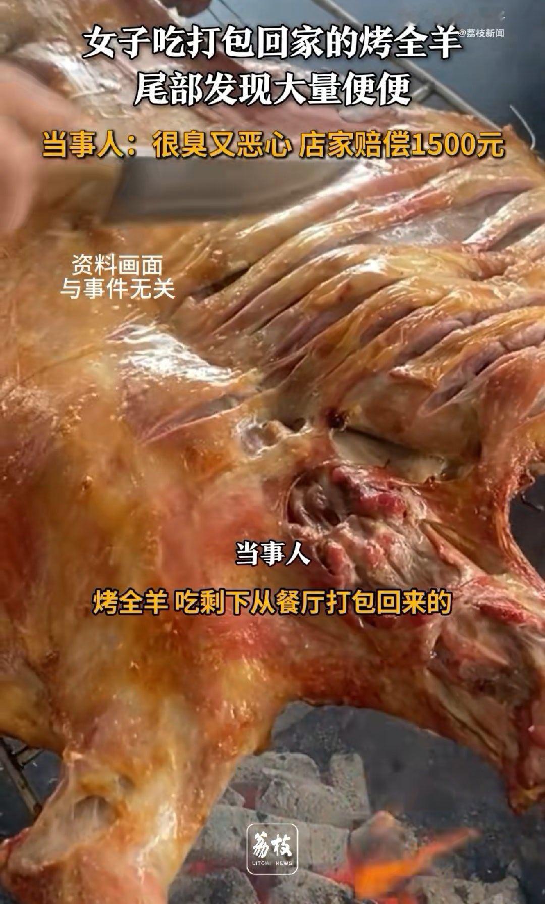 吃烤全羊发现大量粪便店家赔偿1500看前面还想说这羊烤的可以,看着很有食欲,但后面那羊屎疙瘩一出来,感觉赔偿1500有点少,哈哈哈~