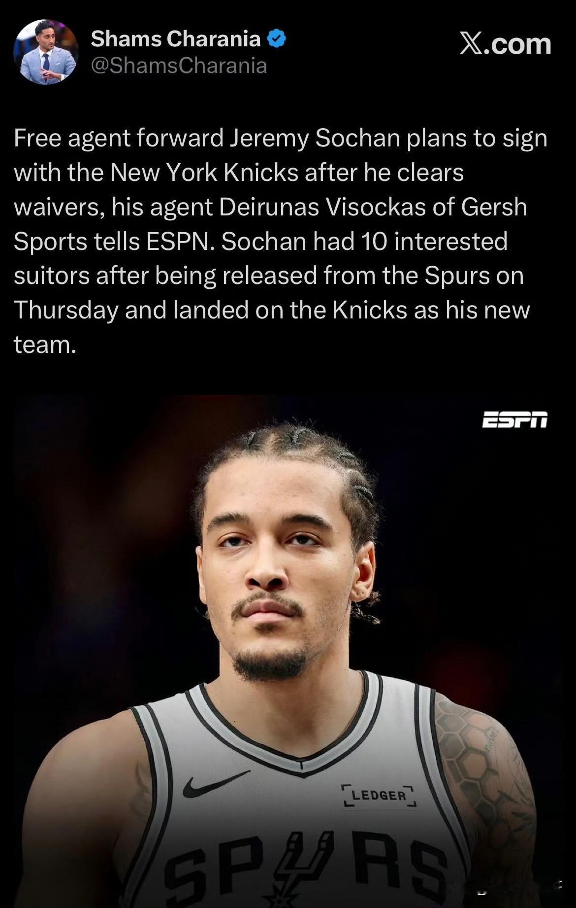 引10支球队哄抢,索汉最终加盟尼克斯!!!新年爱好打卡 根据记者Shams最新消息透露,昨天刚刚和马刺分手的自由球员索汉选择加盟尼克斯! 据相关消息透露,索汉在成为自由球员后获得了多达10支球队的兴趣,他们都有意拿下这位可以持球的前锋,但是最终他还是被大苹果城所吸引,前往东部挑战一下。 这其实就是典型的你想交易的时候没人报价,如果成为自由球员那么大家抢着签,白菜价肯定更容易引起多方争夺。 索汉在尼克斯能够获得多少机会呢,这位前锋也有点不三不四,作为小前锋他没有投射,作为大前锋他又体型不够,203cm的身高也没有任何优势,不过还是希望他能在尼克斯打出好的表现。尼克斯
