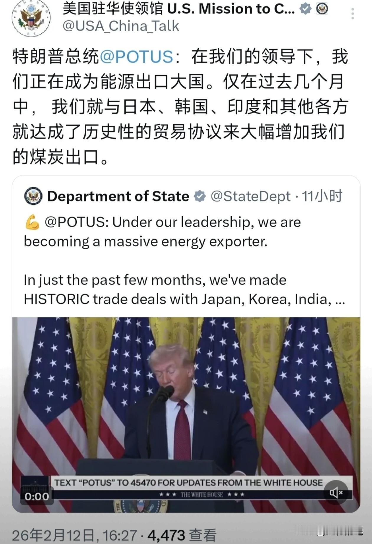 美国驻华大使馆转发特朗普自吹自擂的言论,炫耀在特朗普的霸权主义威逼之下,与其他国家签订的不公平贸易协议,让美国正成为能源出口大国。 感觉这种如同打劫一般得来的成绩,美国政客不但没有半点觉得不好意思,反而觉得成就感爆棚,迫不及待向国际炫耀。 只能说,这种不知羞耻的国家,真的令人大开眼界,做强盗都做得正义凛然了,这不是在秀政绩,而是在秀下限。