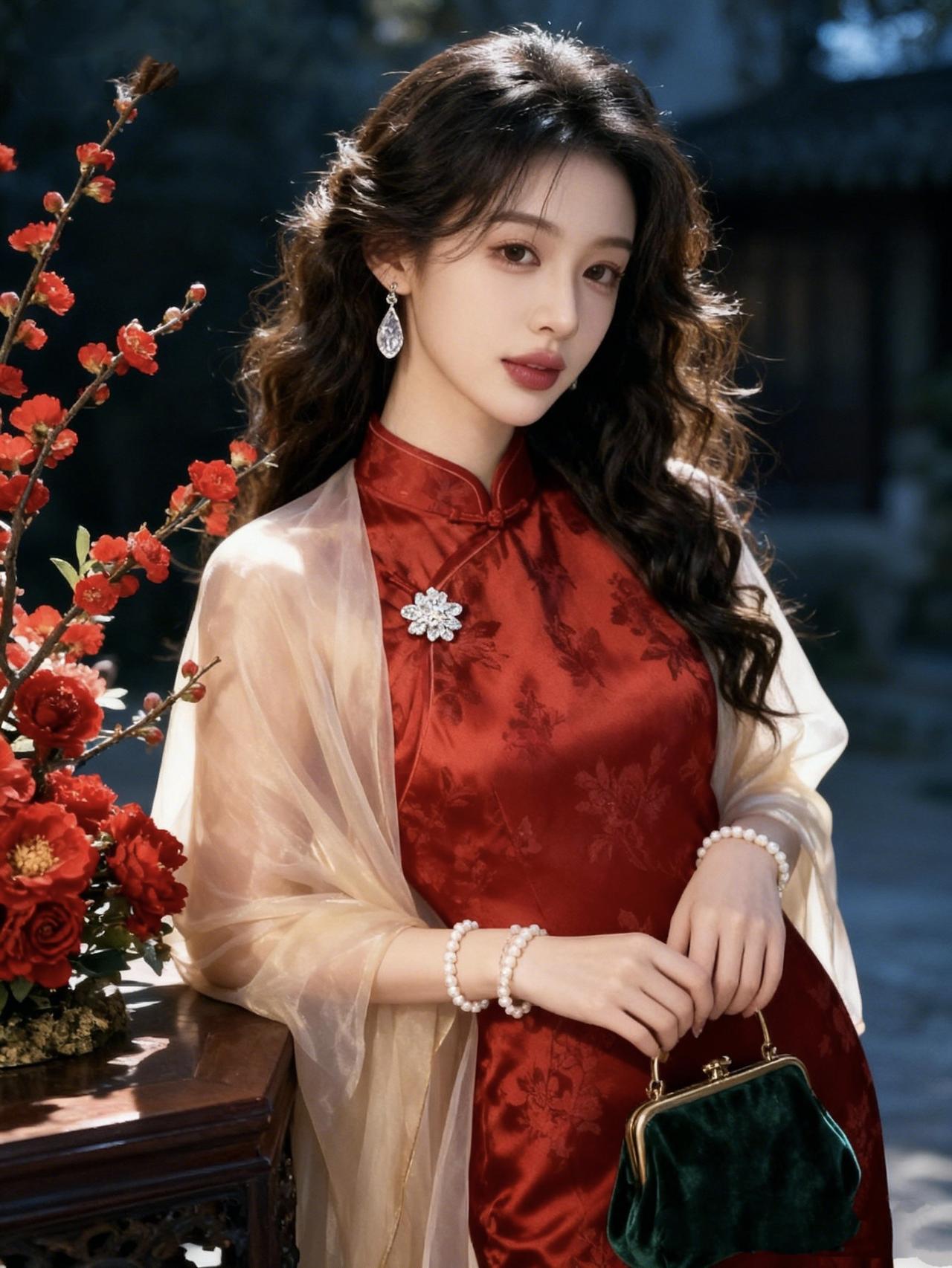 《朱颜绮梦》 朱红暗纹织就时光的褶皱 立领盘扣锁住一帘幽梦 丝缎在光影里流转 像把旧年的胭脂 轻轻晕在岁月的衣襟 梅枝斜倚,暗香浮动 与你鬓边的卷发相映 珍珠串起细碎的温柔 丝绒手袋藏着心事 在晚风里轻轻晃动 薄纱如雾,笼住半肩清辉 钻石胸针是星子落于衣襟 你倚着雕花案几 眼底盛着江南的烟雨 也藏着旧时光里的惊鸿 每一寸绸缎都在诉说 东方的雅致与风情 每一缕发丝都在摇曳 古典与摩登的相逢 而你站在画中 成了这抹朱红里 最动人的留白 粉裳花影照 粉梦绮韵 锦裳光影绮梦 华裳鬓影 复古绮梦影 浮景星梦残页 红韵复古套裙 紫韵纱影民国