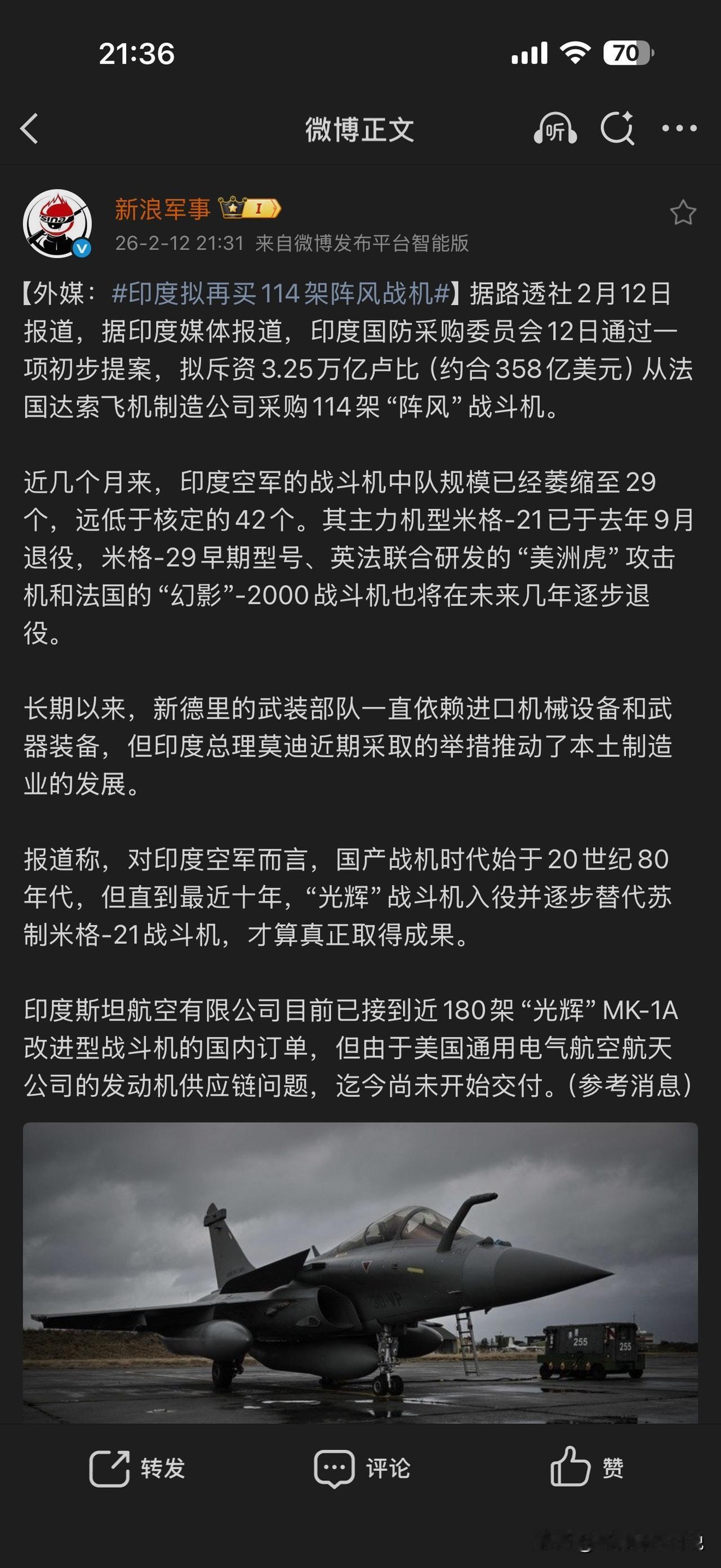 印度居然又打算购买114架法国阵风战机了,这购买的频率是不是太高了点儿?三天两头听说要买战机,就这样还说战机数量远远不够呢,其原本打算的战斗中队应该有42个,但现在却只有29个,还差整整13个!印度给出的理由是原来的主力机型米格-21已于去年9月退役,米格-29早期型号、“美洲虎”攻击机和法国的“幻影”-2000战斗机也将在未来几年逐步退役,而恒河老祖光辉战机又迟迟不能交付。但我总觉得是不是摔得太多,而很多坏了的战机又修不好才导致的数量短缺!否则不可能这么高频次和大规模的采购。[捂脸]