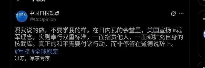 《中国日报》在X平台发表洪源点评美国在日内瓦裁军大会让中国裁减战略武器的谬论。