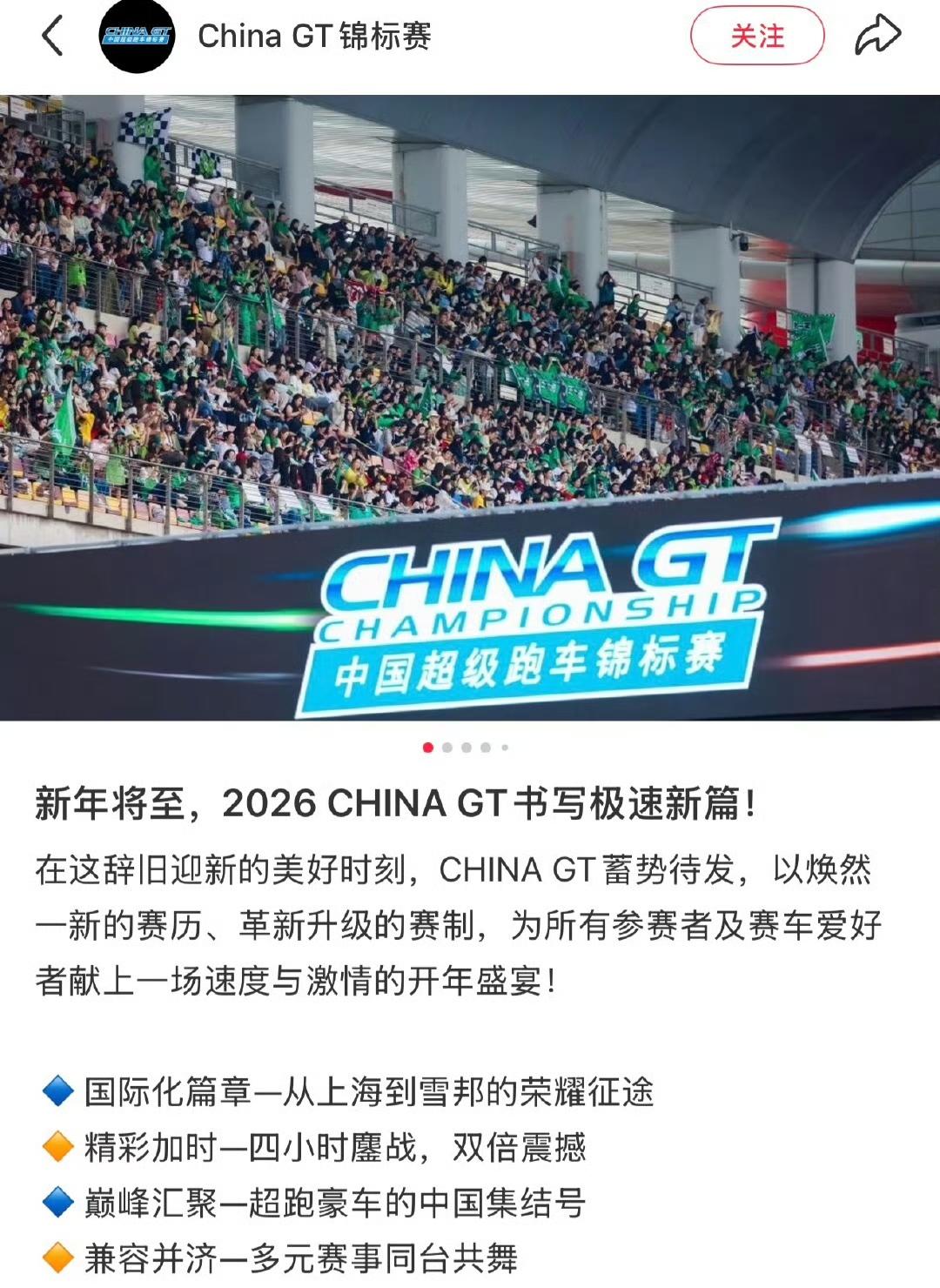 China GT中国超级跑车锦标赛官号发表新年美好祝愿:新年将至,2026 CHINA GT书写极速新篇。 而官方配图中是看台上再耀眼不过的摩托姐姐哦,摩托姐姐和王一博一起闪闪发光,China GT更是清清楚楚的知道谁是真正为比赛带来泼天流量和关注度热度的所在,是王一博和王一博的摩托姐姐们!