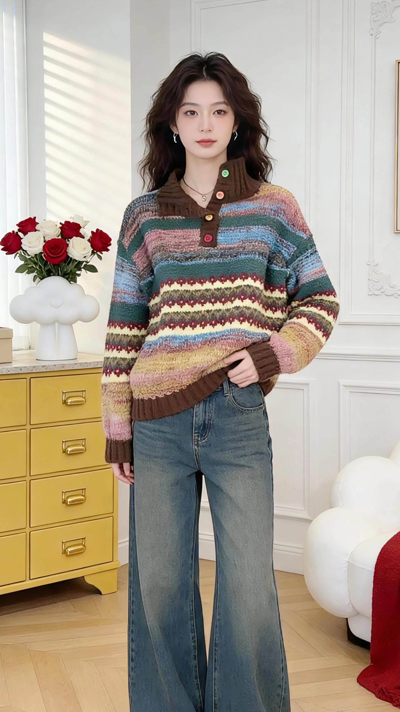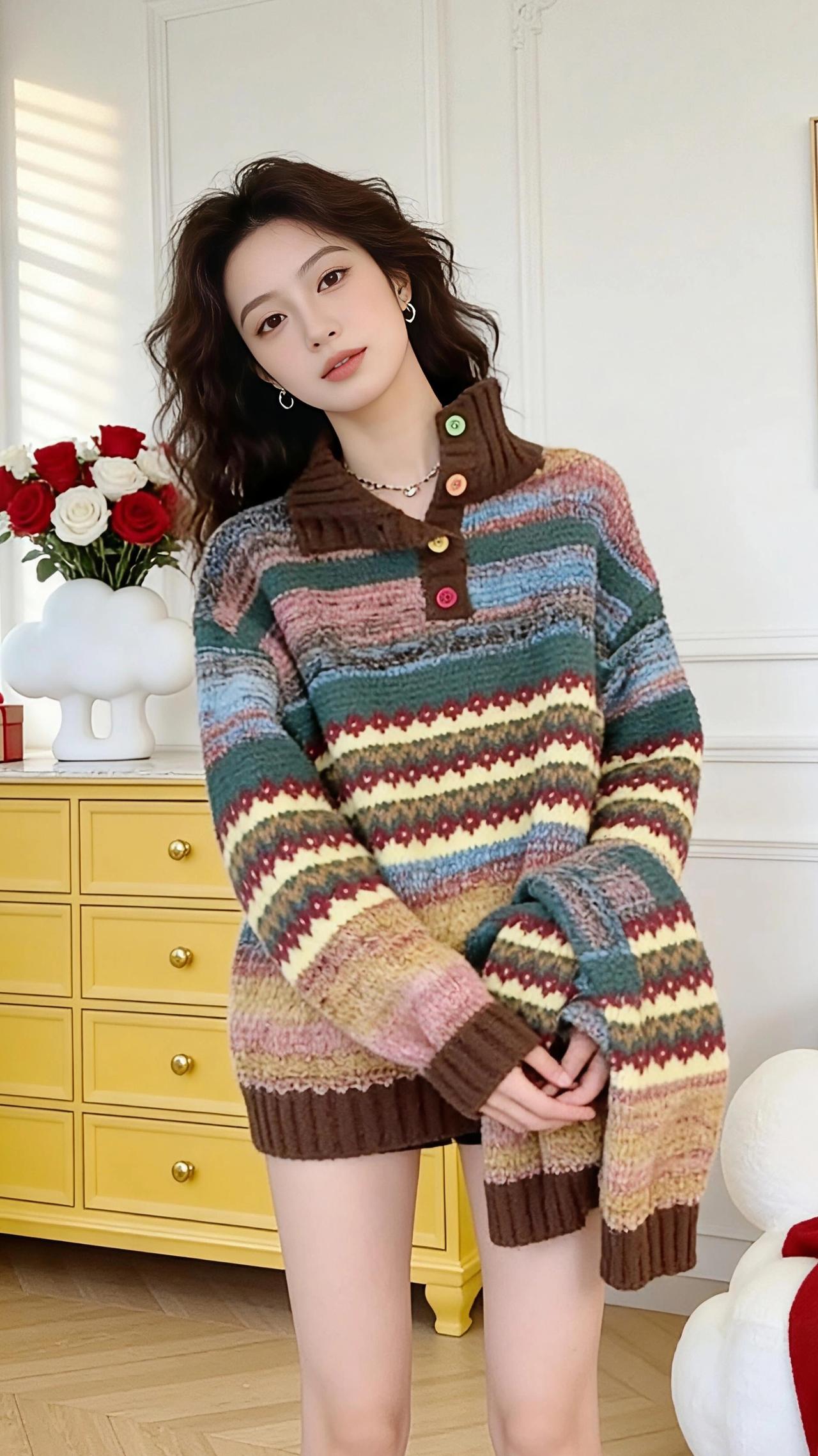 彩条毛衣里的温柔时光 阳光漫过百叶窗,在米白墙面上投下细碎的光影,像极了这件毛衣上的纹路。 深棕的翻领裹着颈间的暖意,彩色纽扣像春日里的小野花,缀在衣襟上。绿、粉、蓝、米黄的条纹层层叠叠,混着柔软的绒感,像把一整个秋天的落叶与晚霞都织进了针脚里。 她站在那里,指尖轻捻一缕卷发,或是将手插进牛仔裤的口袋,又或是把同色系的围巾拢在臂弯。每一个姿态都漫不经心,却又像在细细摩挲着时光的纹理。 黄色的斗柜上,红玫瑰与白玫瑰静静盛放,大理石台面映着窗外的天光。风从窗缝溜进来,带着一点冬日的清冽,却被毛衣的暖意轻轻接住。 这不是什么盛大的场景,只是一个寻常的午后,一件旧毛衣,一束花,和一段被温柔包裹的时光。 高级感穿搭 新年穿搭 针织毛衣 穿搭