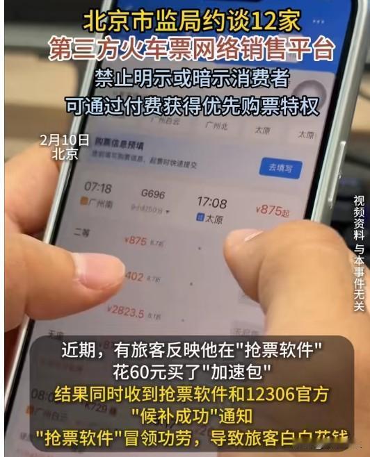 12家第三方火车票网络销售平台因引导付费优先购票被约谈,"花钱插队"的抢票模式面临整治。近年来,"VIP加速""抢票套餐"等付费服务层出不穷,看似自愿选择,实则利用信息差诱导消费者多花钱。有调查显示,付费抢票成功率与普通购票并无显著差异,很多平台存在"虚假加速"。 此次约谈释放出明确信号:公共服务不能搞"付费优先"。火车票本质是准公共产品,关系民生公平。平台可以提供增值服务,但不能把"抢票"包装成必选项,更不能在12306之外搞"特殊通道"。整治付费抢票,不仅要规范平台行为,更要优化12306的官方服务,让普通购票体验真正提升。