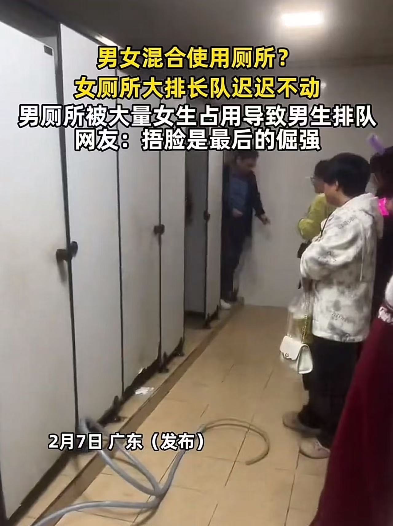 网传视频显示,女厕所外,队伍蜿蜒如长龙,少则二三十人,多则五六十人,个个焦躁不安、原地踱步。有人实在憋不住了,一咬牙,带头冲进了隔壁空荡荡的男厕所。