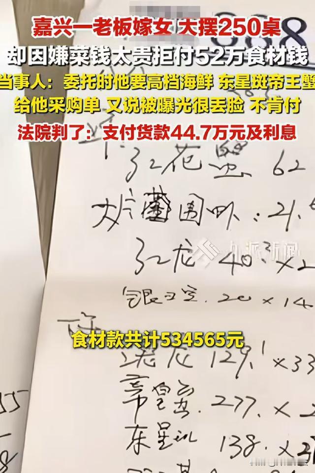 浙江桐乡,富豪为嫁女儿大摆250桌酒席,委托一老板为他提供食材,酒席上东星斑、澳龙应有尽有,富豪赚足了面子,可事后双方一对账,富豪觉得53万太贵不肯付钱,只愿意承担27万,两人打起了官司,喜事沦为了笑柄。 据九派新闻报道,钱某是个大老板,家底非常殷实。 2025年5月1日,钱某的女儿要结婚,为了给女儿办一个风风光光的婚礼,钱某提前几个月开始准备。 钱某决定在家给女儿办婚礼,但是在家办并不意味着不上档次,钱某特意找了厨师团队,又找了王某给他提供食材。 3月30日,钱某让找的厨师试烧了6桌酒席试菜,王某送去了六桌酒席需要的食材,共计9353元。 这次试菜,钱某非常满意,不仅定下了厨师,还确认了和王某的合作。 钱某和王某达成一致,决定女儿的婚宴,就由王某来提供食材、调料等物,这次试菜的9000多元,等办完酒席一块付。 这里,钱某与王某已经达成了口头协议,双方构成了事实上的买卖合同关系。 《民法典》第四百六十九条规定,当事人订立合同,可以采用书面形式、口头形式或者其他形式。 双方虽然没有签订书面合同,但试菜及后续供货行为,表明双方意思表示一致,合同成立并生效。 很快,好日子来了,2025年4月29日,钱某家的宾客陆陆续续到场。 29号中午,钱某摆了18桌酒席,晚上人更多,足足坐了85桌。 第二天中午,钱某又摆了30桌,晚上92桌。 到了钱某女儿结婚的正日子,也就是5月1日,钱某设宴25桌,正席更是有250桌。 每一天的席面上,蔬菜水果、海鲜、鸡鱼肉蛋,都应有尽有。正席这天,鲍鱼、澳龙、东星斑,更是一个不差。 女儿的婚礼办的热热闹闹,三天的流水席,更是让钱某赚足了面子。 因为宾客太多,钱某那几天忙得脚不沾地,王某将食材送过来后,双方也没有进行核对。 三天后,女儿的婚礼结束了,钱某和王某也开始对账算账,对账期间,两人却闹翻了。 原来,王某算的账里,这几天他为钱某提供的蔬菜水果、鸡鱼肉蛋,以及最贵的海鲜,加起来一共有533076元。 但是钱某一看这个数字,当时脸色就变了。 钱某仔细一看,觉得王某给他提供的食材不仅价格太高,数量也不多。 原来,钱某为了酒席办的体面,让王某送了大量的海鲜,但是海鲜这个东西,价格不是一成不变的,基本都有个市场调节价。 王某认为,钱某给女儿办婚礼的时候,正好是过节,那段时间食材本身就涨价了,并不是他故意抬高价格。 但是钱某却认为,就算食材有涨价,也不应该这么离谱,他觉得,这几天的酒席,王某提供的食材,总价应该在30万以下。 可是,当时因为太忙,钱某和王某又没有核对数量和市场价,事后算账也提供不了凭证,双方对费用数额的认定相差太大了。 因为协商不一致,王某气愤之下,直接将钱某告了。 庭审时,王某提供了其他同行的报价单,以此证明自己没有虚抬价格。 可是钱某不认可,他认为,食材的品质对价格影响太大,并且,拿货的数量也对价格有影响,就算名字一样,也不能认定王某提供的食材和别人的食材价格是一样的。 《民法典》第五百一十一条第二款规定,价款或者报酬不明确的,按照订立合同时履行地的市场价格履行;依法应当执行政府定价或者政府指导价的,依照规定履行。 王某提供了其他同行报价单,证明自己没有虚抬价格,但钱某不认可,认为食材品质和拿货数量会影响价格。 食材本身确实有个市场调节价,因为双方没有当场核对,王某提供的食材,当时市场价就成了关键。 《民事诉讼法》第六十七条,当事人对自己提出的主张,有责任提供证据。 钱某认为价格过高,需承担举证责任证明王某存在虚抬价格的情况,但他未能提供有效凭证。钱某无法举证,应承担不利后果。 所以,法院在参考了市场情况、行业惯例等因素后,最终判决钱某支付447000元货款,以及逾期付款导致的利息损失。